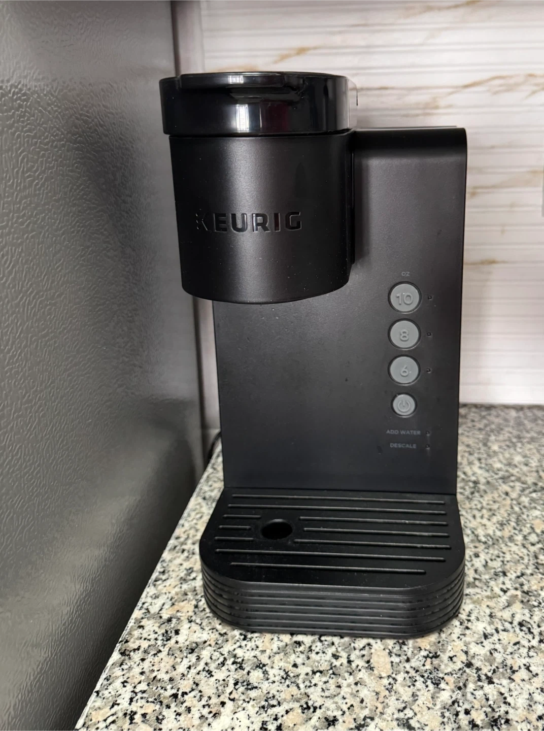 This is a black Keurig single serve coffee maker. It has buttons for 6, 8, and 10 oz brews. It also features 'Add Water' and 'Descale' indicators.