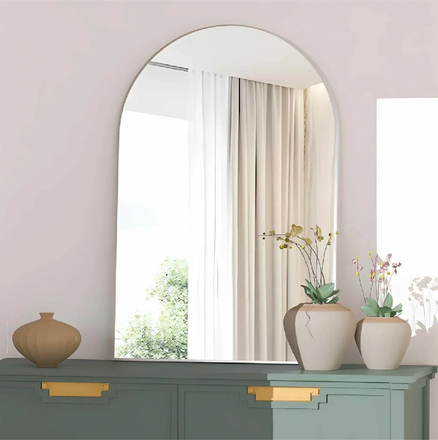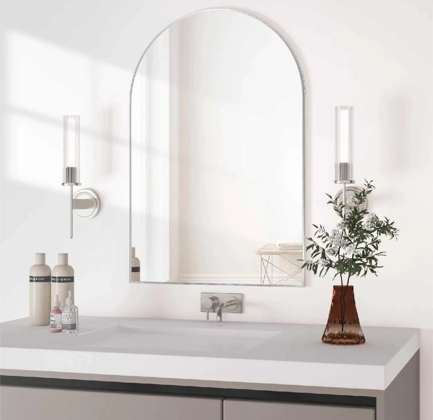 Brighten up your bathroom with this brand new x36" arch bathroom mirror, still in its original packaging, featuring a sleek silver metal frame, adding a touch of modern elegance to any space.
