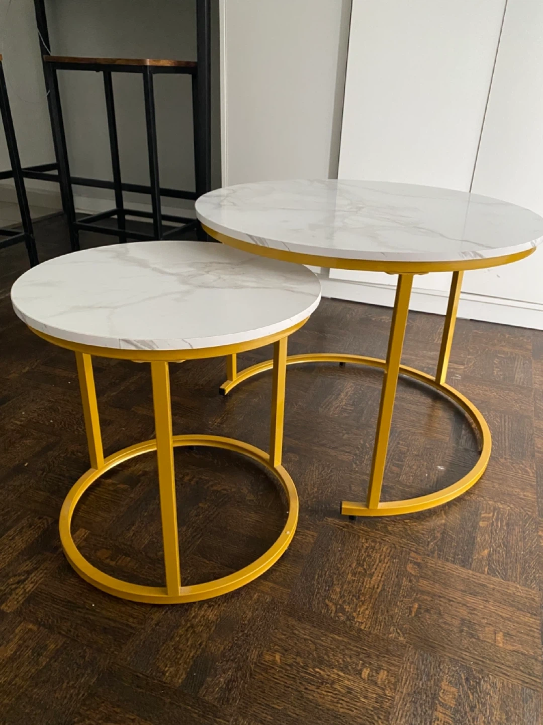 Stylish set of two round nesting coffee tables. Features a faux marble top with gold metal legs. Smaller table tucks neatly under the larger one for space-saving. These tables are great for adding a decorative touch to your living space!