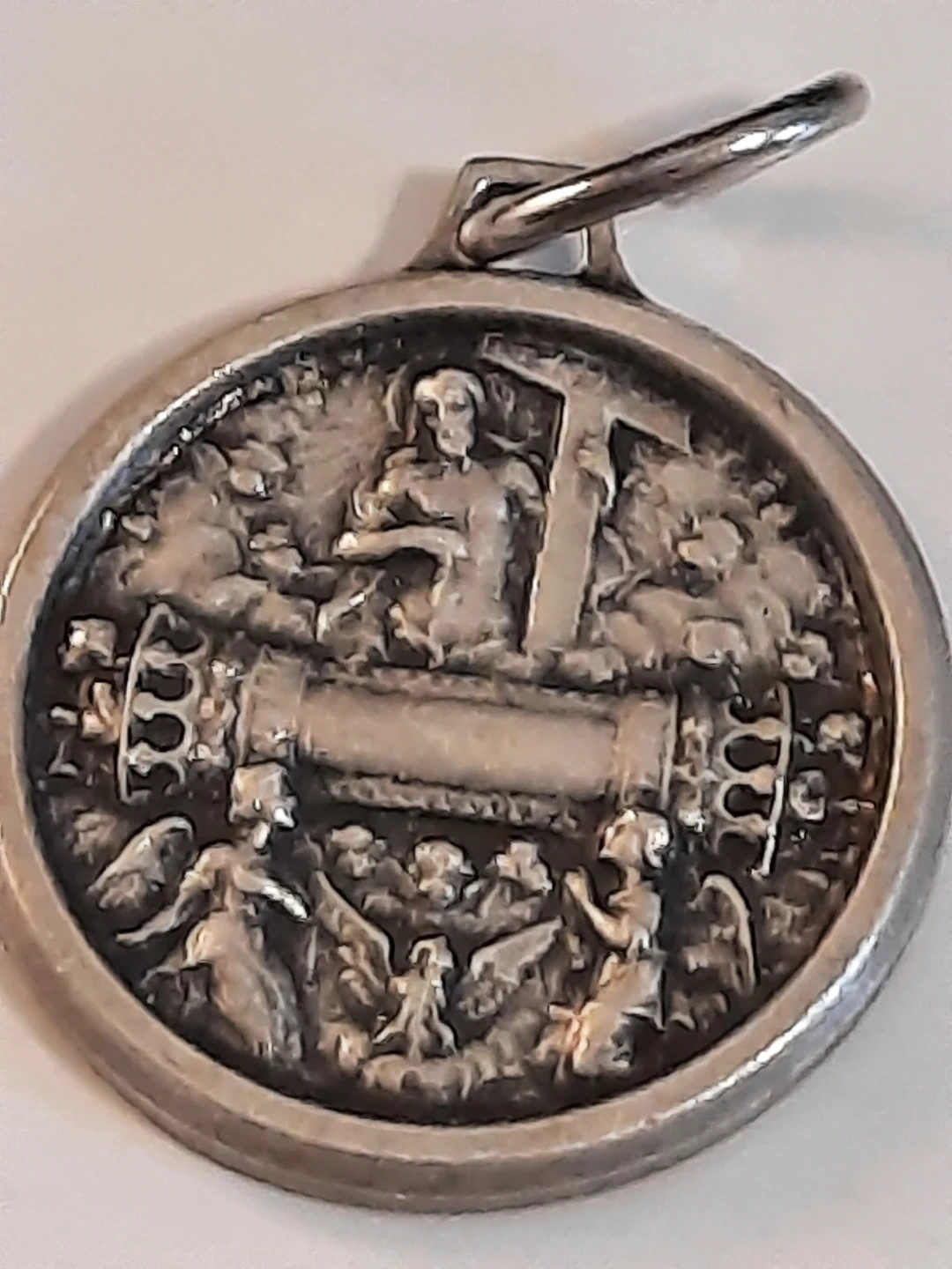 A double-sided religious medal pendant. One side features Jesus Christ wearing a crown of thorns, and the other depicts Christ rising from a tomb with angels. Made of metal.silver filled.