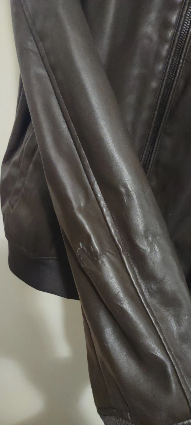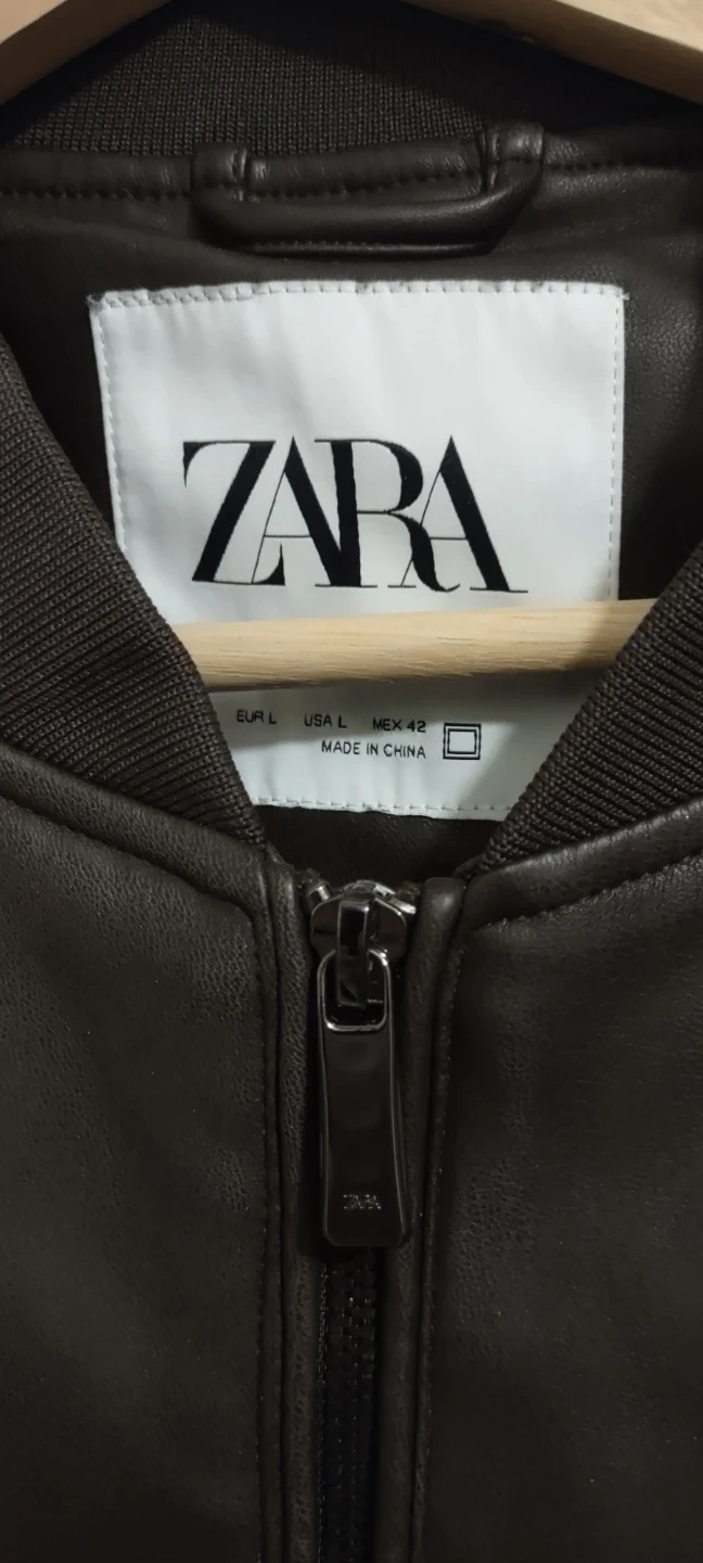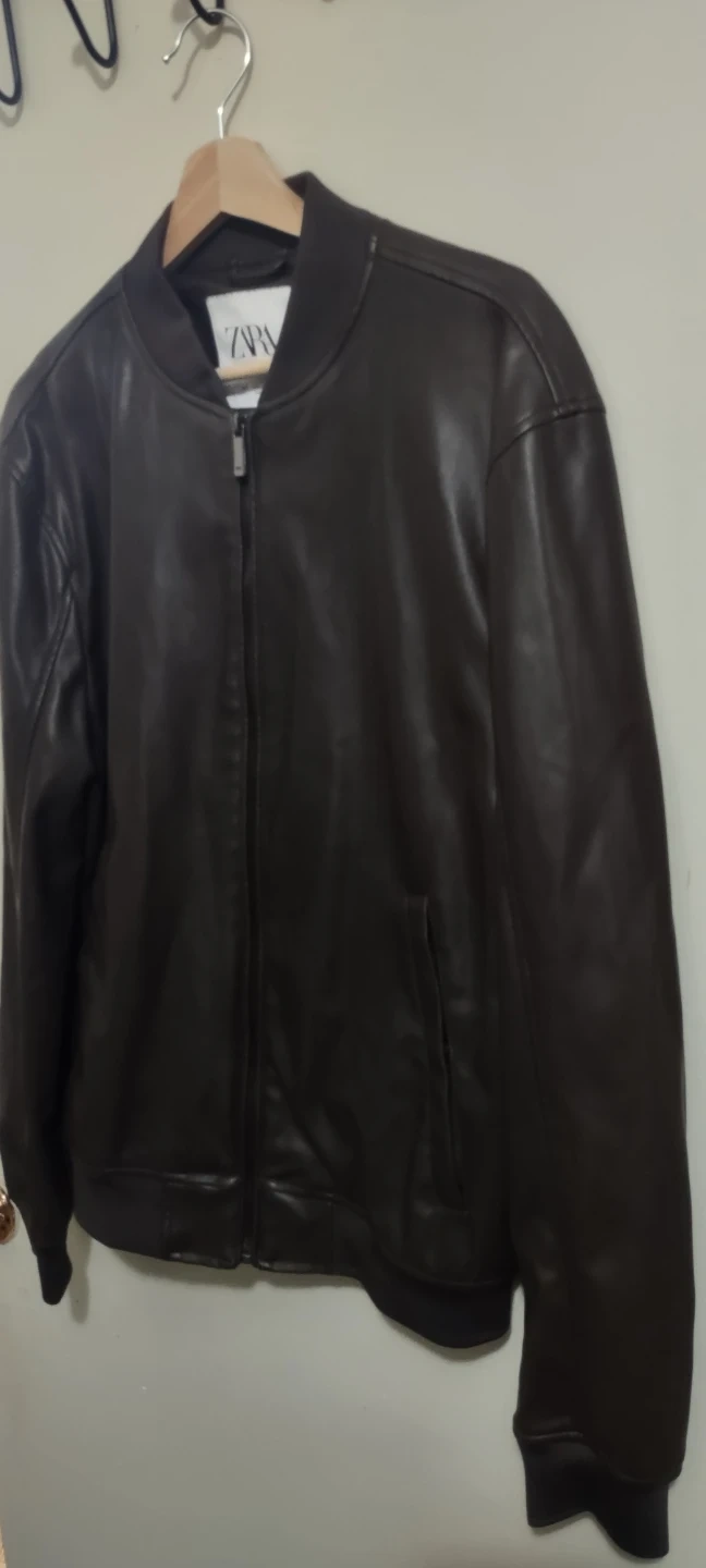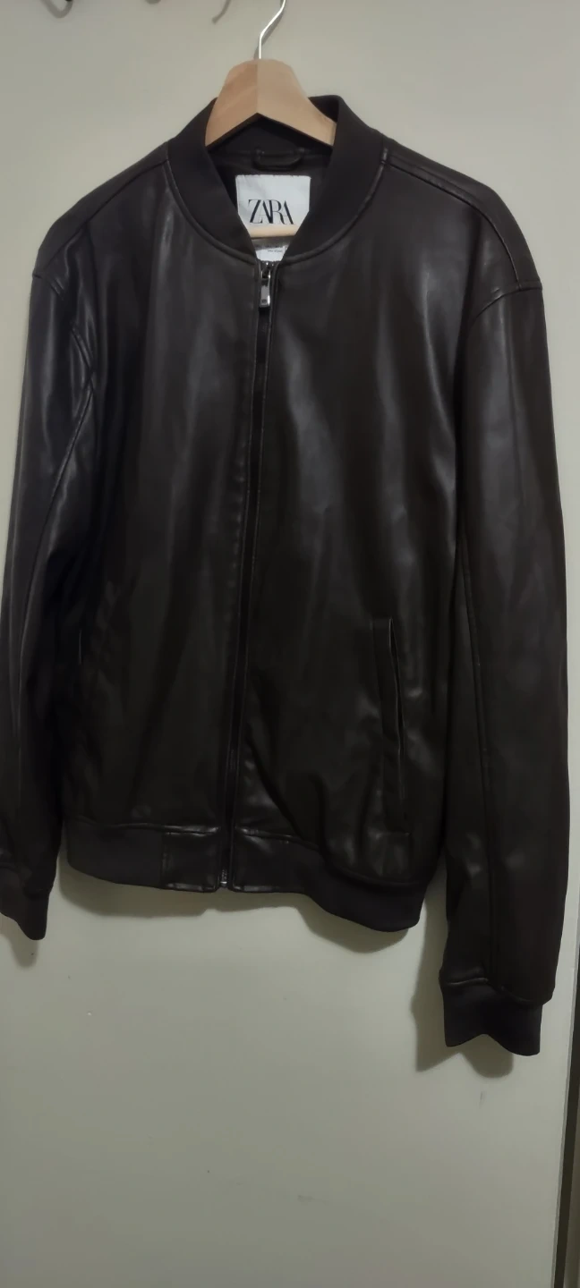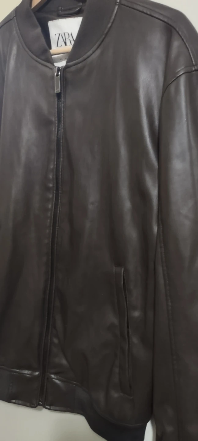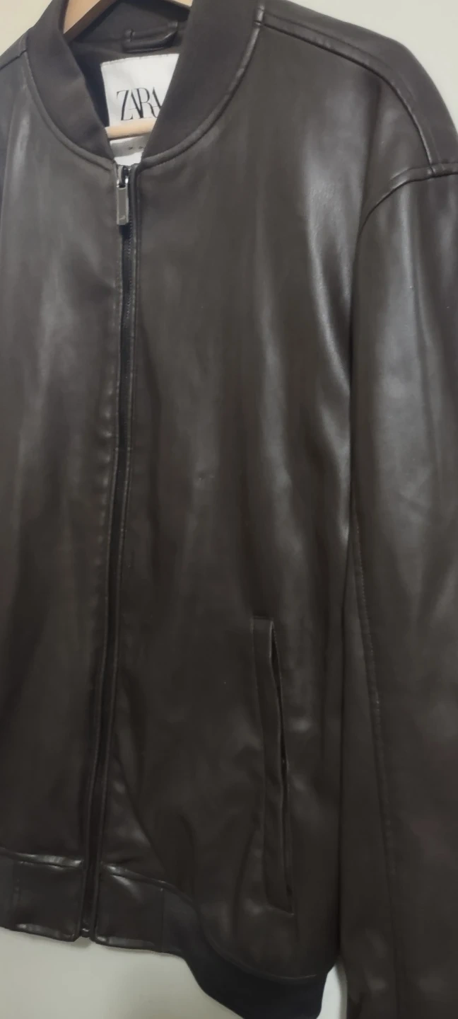 Selling a Zara bomber jacket in a dark brown faux leather. It's a size L.