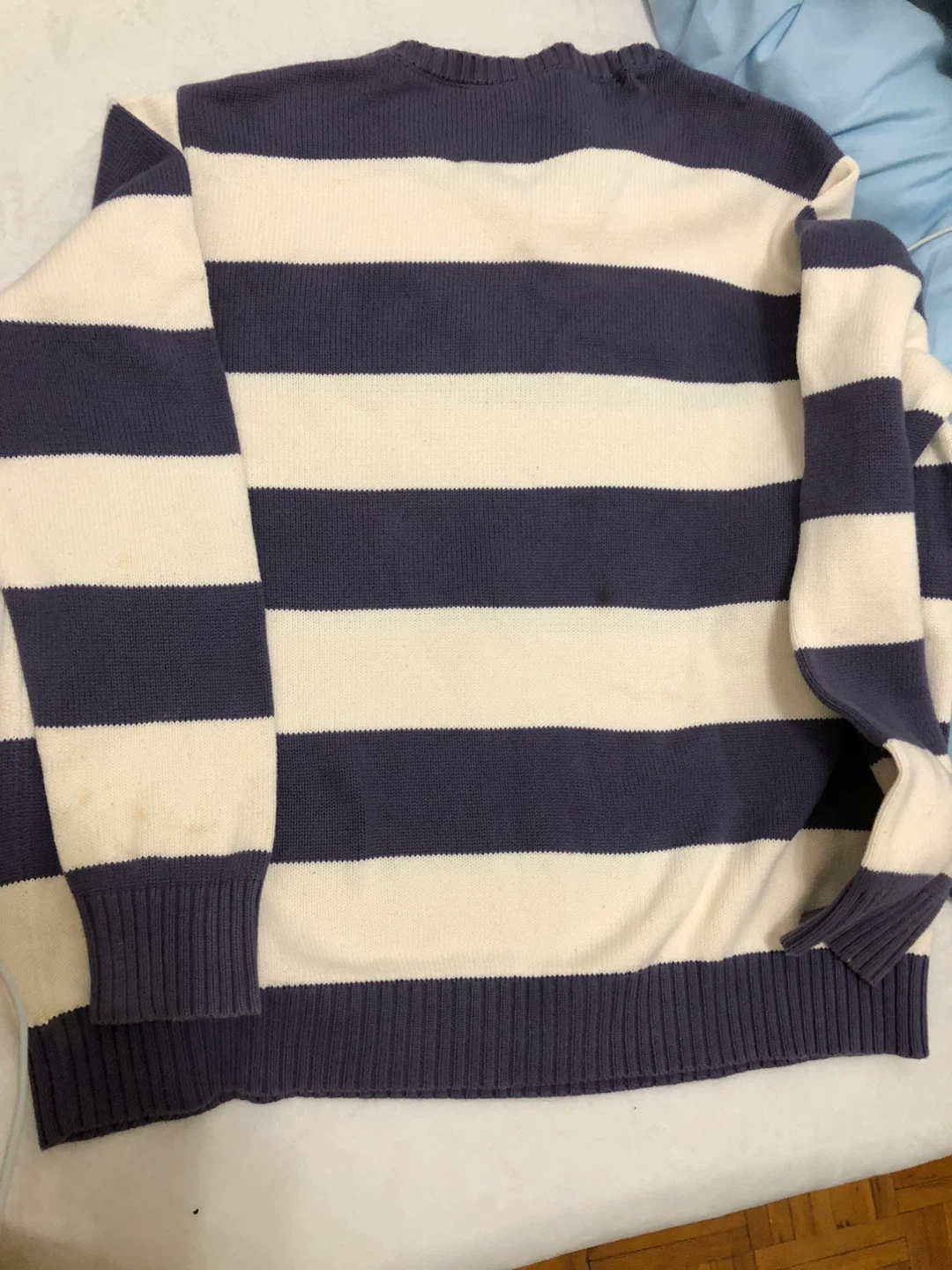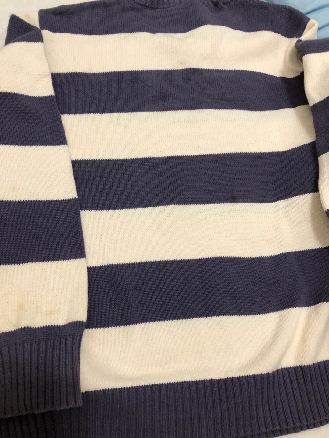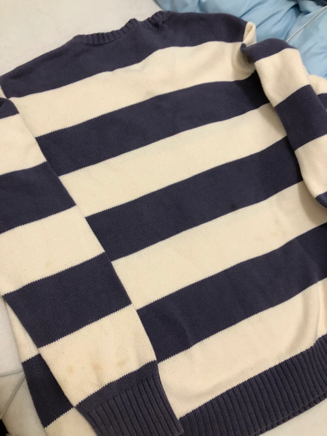 Here's a comfy oversized striped knit sweater! It features a classic design with navy and white stripes. Perfect for adding a touch of nautical style to your wardrobe!