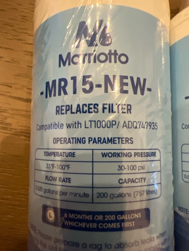 Brand new Marriotto MR15-NEW water filter, compatible with LT1000P/ADQ747935 systems. Ensures your water is clean and fresh. Specifications: Temperature: 33°F-100°F, Working Pressure: 30-100 psi, Flow Rate: 0.528 gallons per minute, Capacity: 200 gallons (757 litres). Priced at $25. If the ad is up, the filter is available!