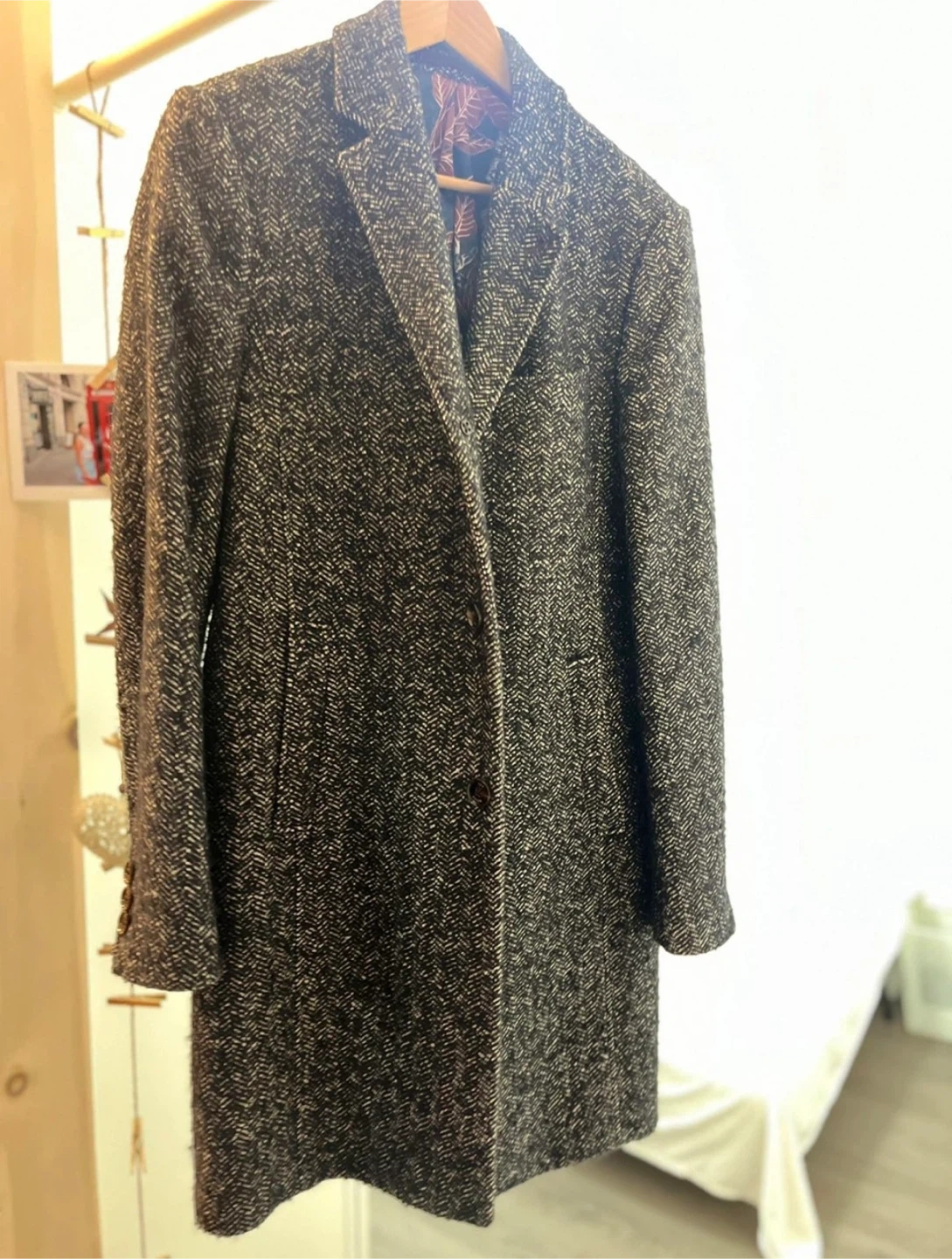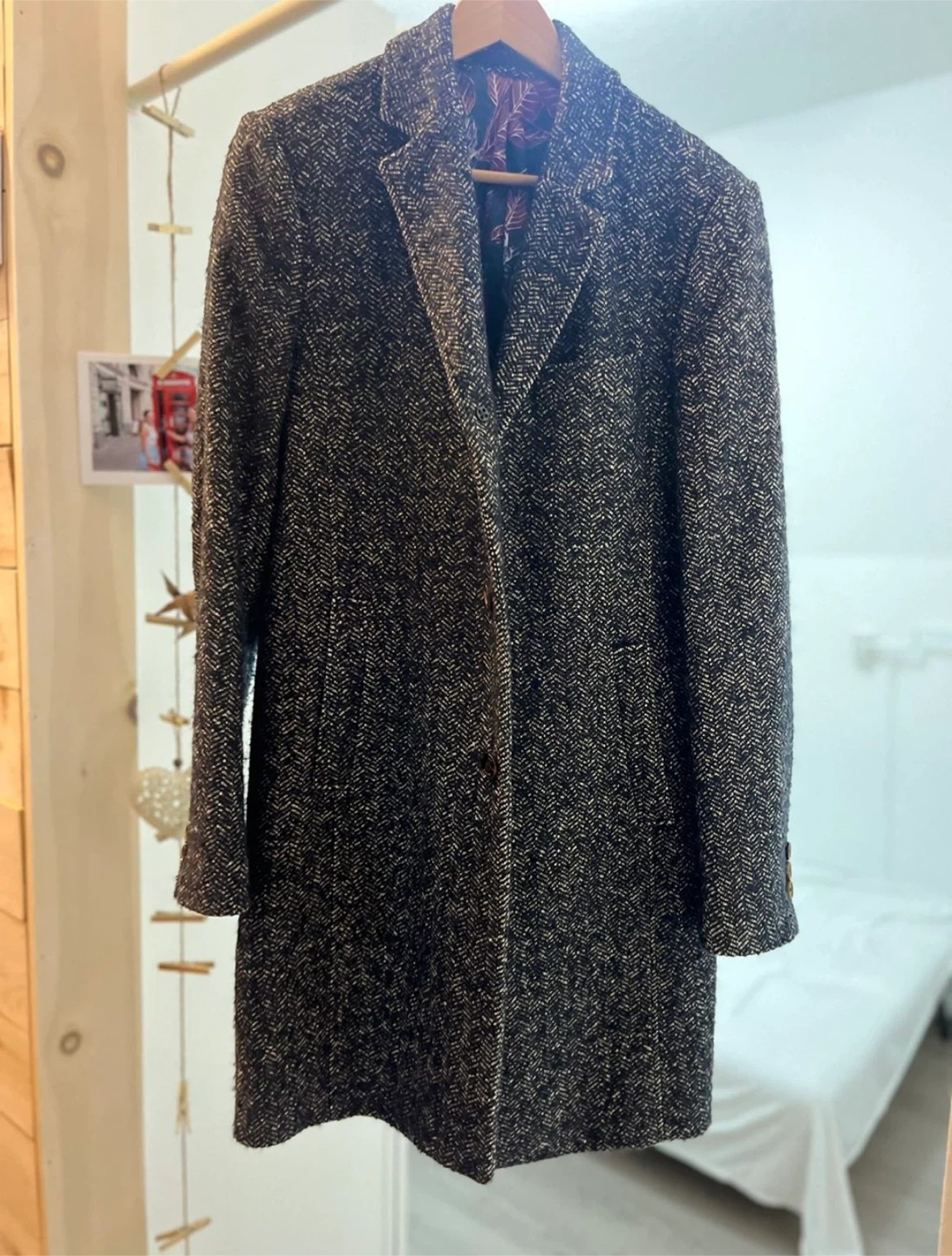 Slim fit coat from pure wool with a herringbone texture, this coat exudes timeless style. A peaked lapel refines the look for everyday wear.