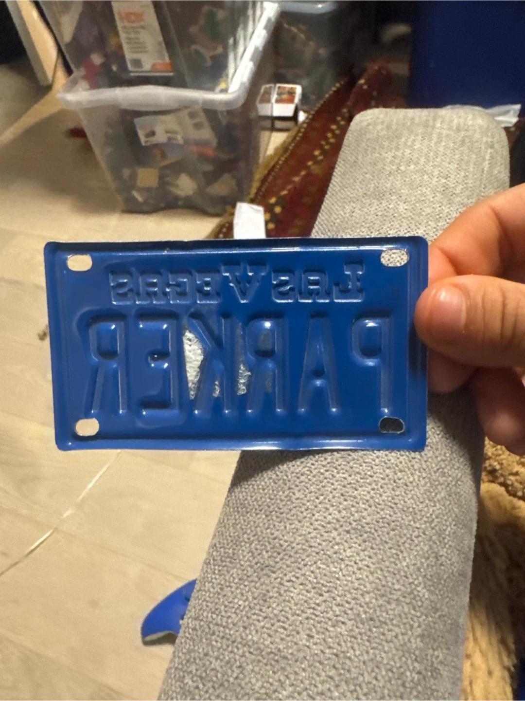 This is a decorative metal plate featuring 'Las Vegas Parker'. It's blue and made of metal. It's useful for decorating a man cave or garage!