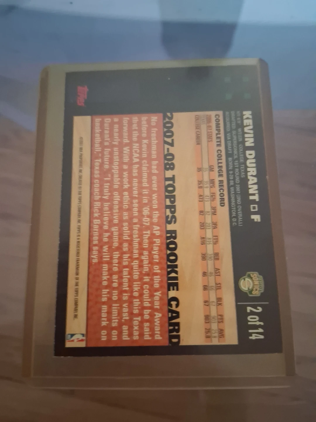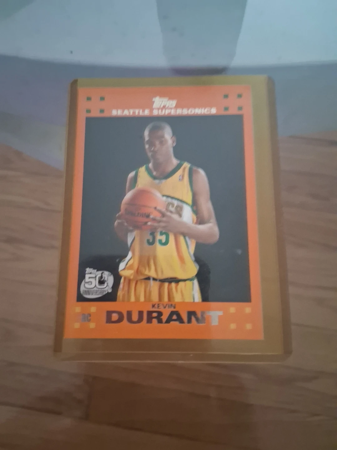 This is a 2007-08 Topps Rookie Card featuring Kevin Durant. It's from his time with the Seattle Supersonics. The card is in a protective case.
