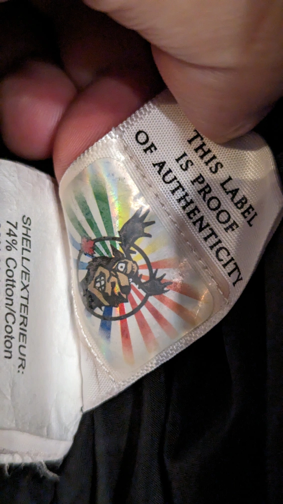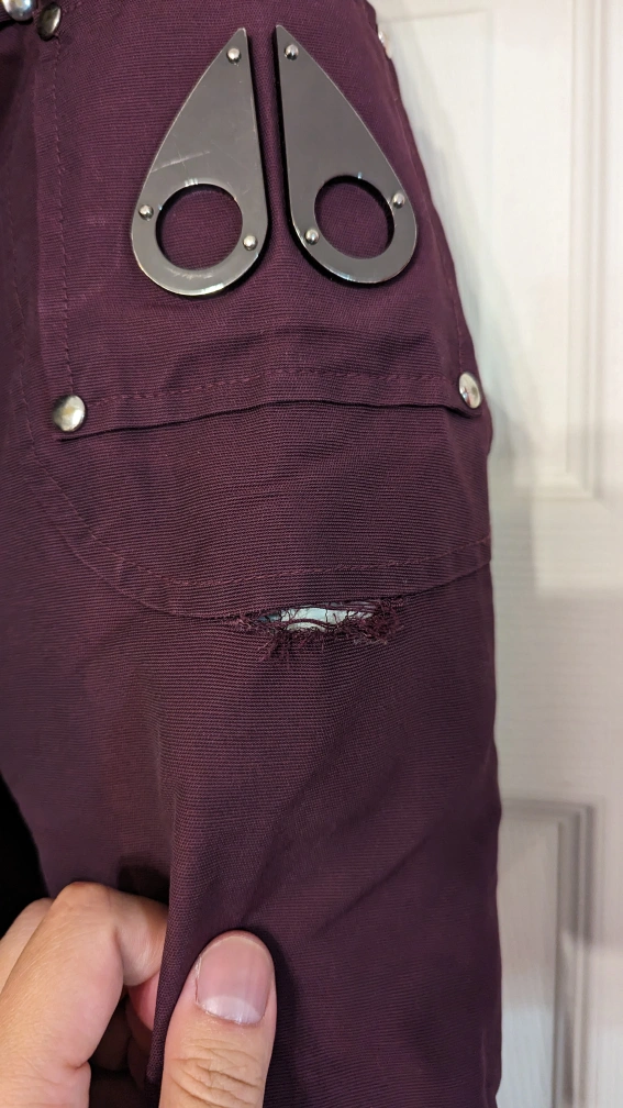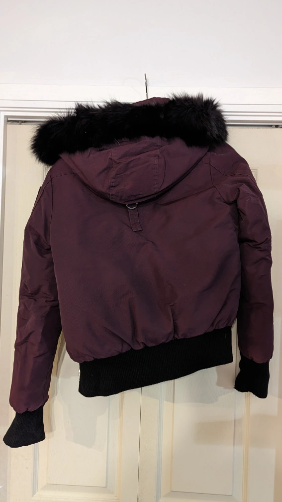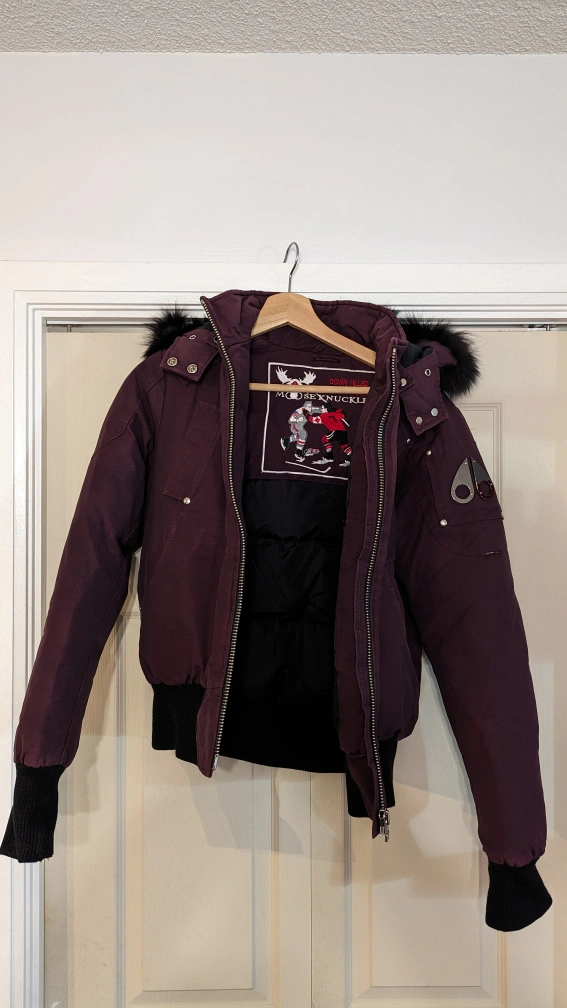 Authenticate Moose Knuckle bomber jacket. There's a tear by the logo on sleeve. This is one of the first original made so have halogram sticker instead of RFID tag for authentication. Just recently dry cleaned