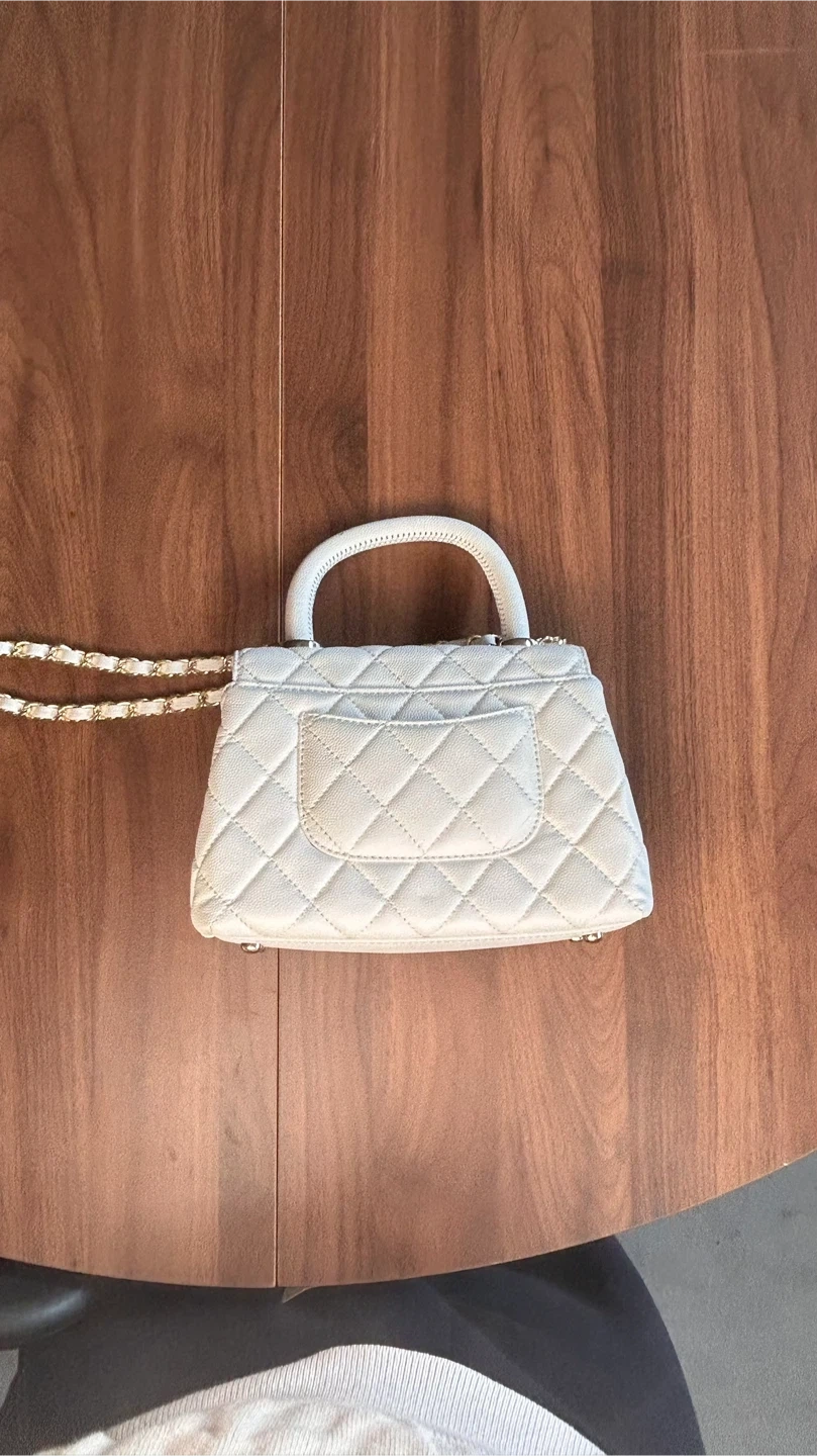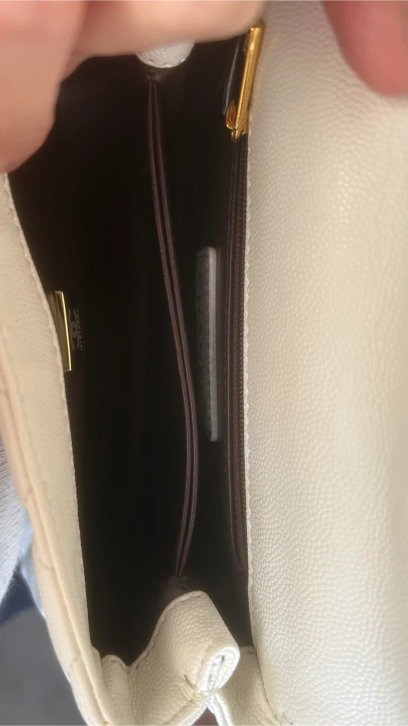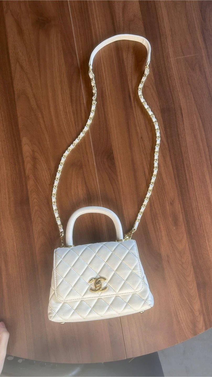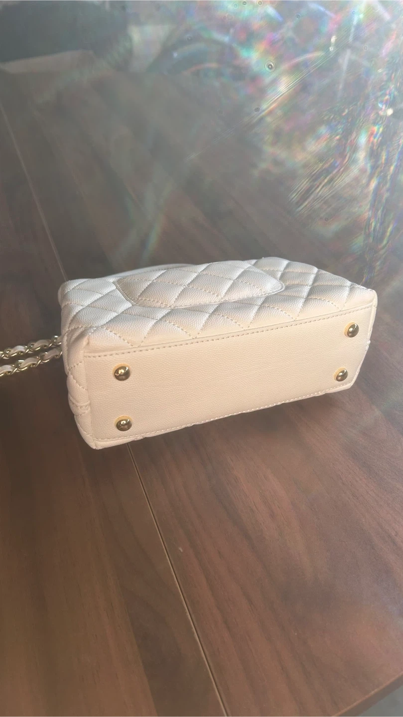 This chic white handbag features classic diamond quilting and a secure gold clasp. It has a top handle and a detachable gold chain strap for versatile carrying options. Interior has a zip pocket.
