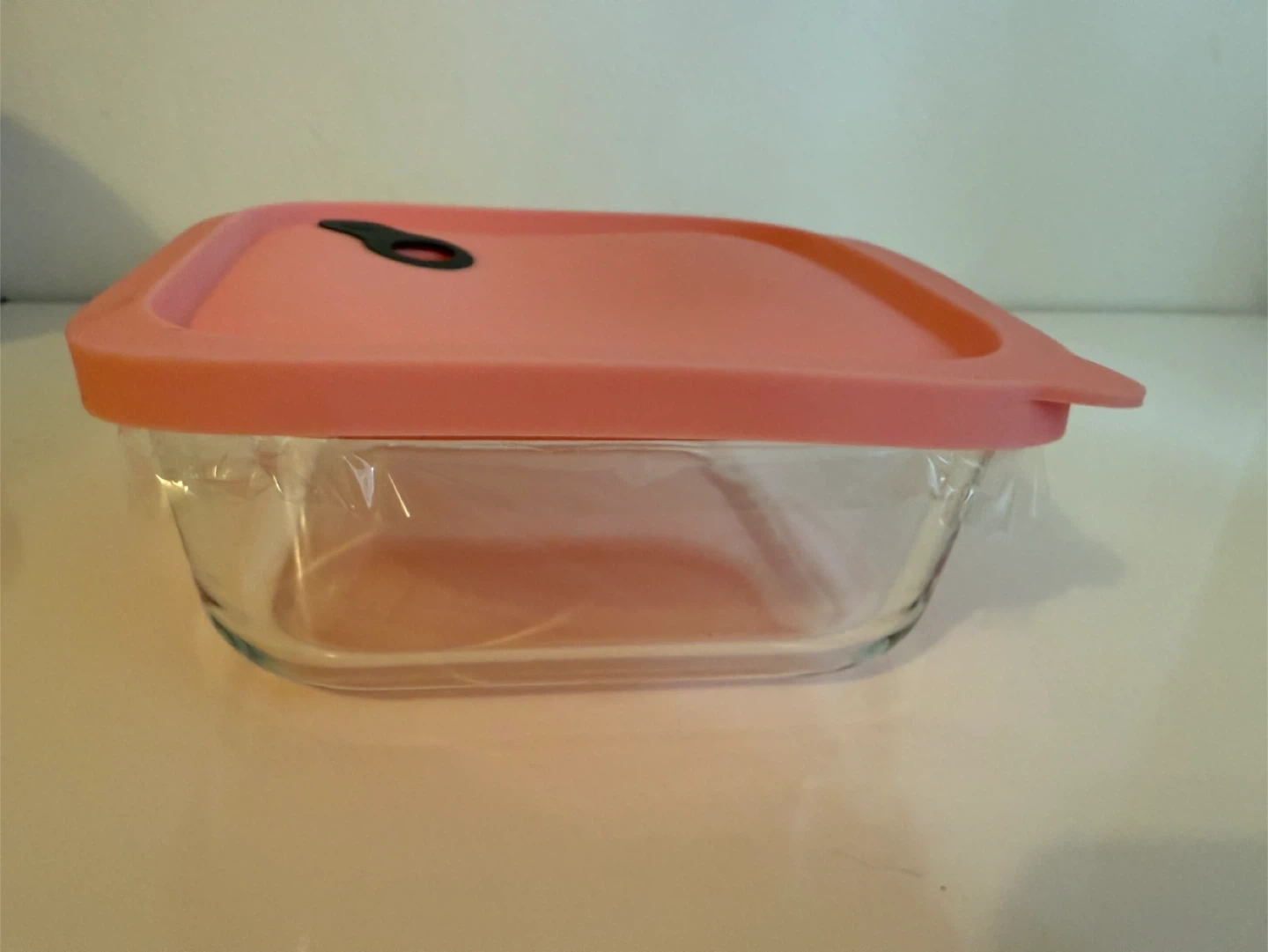 This is a square glass food storage container with a pink silicone lid. It's great for storing leftovers or meal prepping. The glass base is durable and the lid seals well to keep food fresh.
