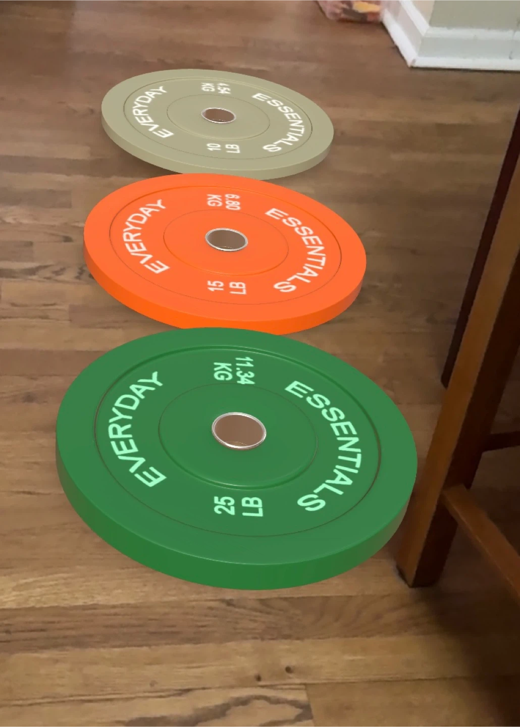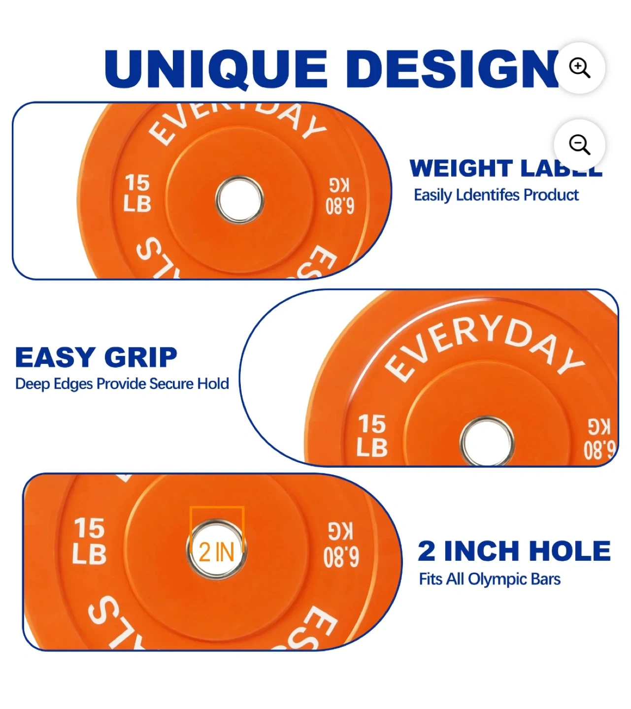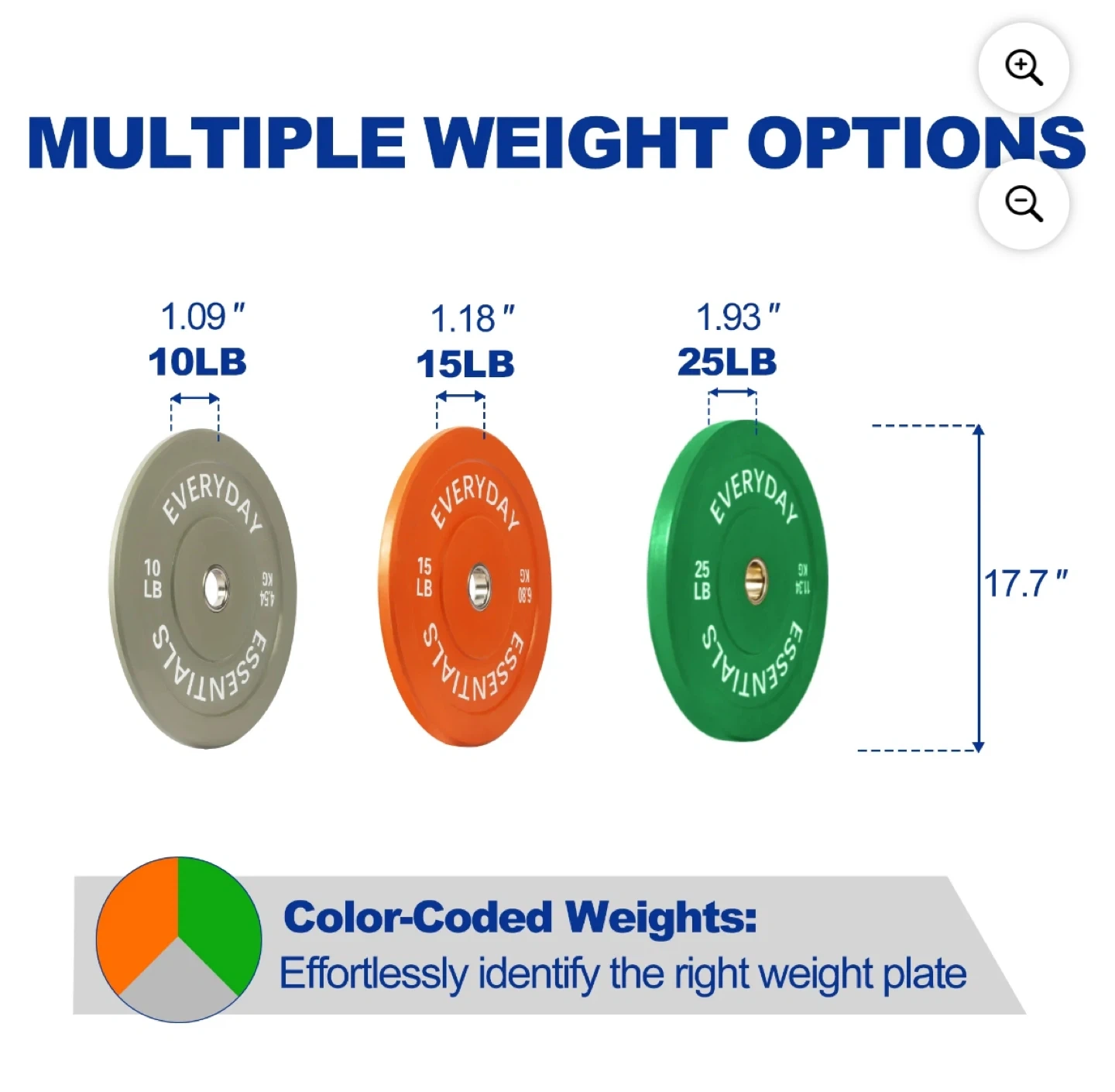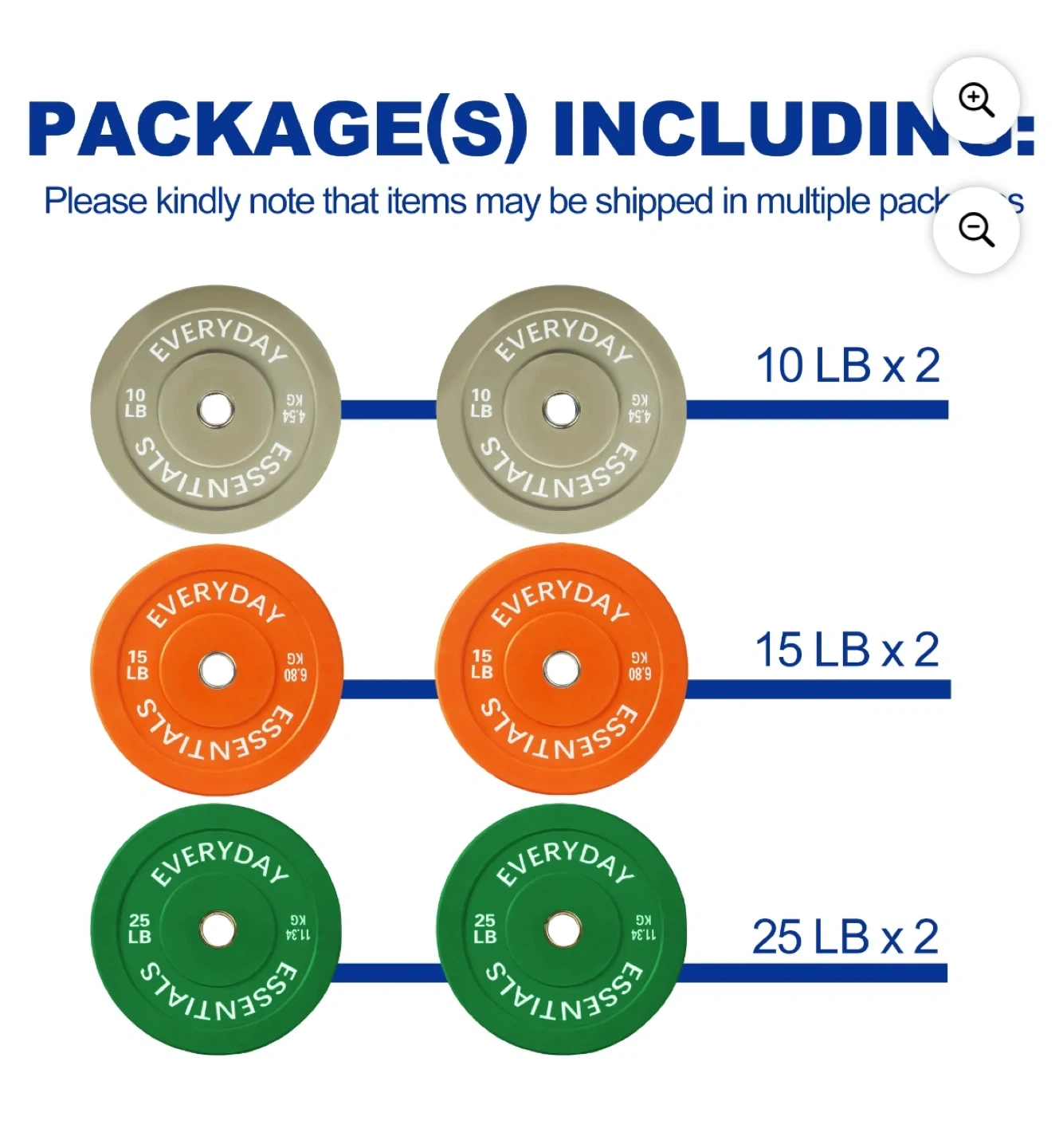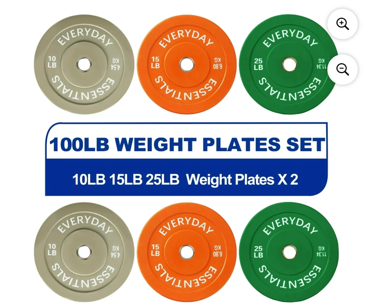 This set includes two 10LB, two 15LB, and two 25LB weight plates for a total of 100LB. They feature a 2-inch hole to fit all Olympic bars. Color-coded for easy identification.