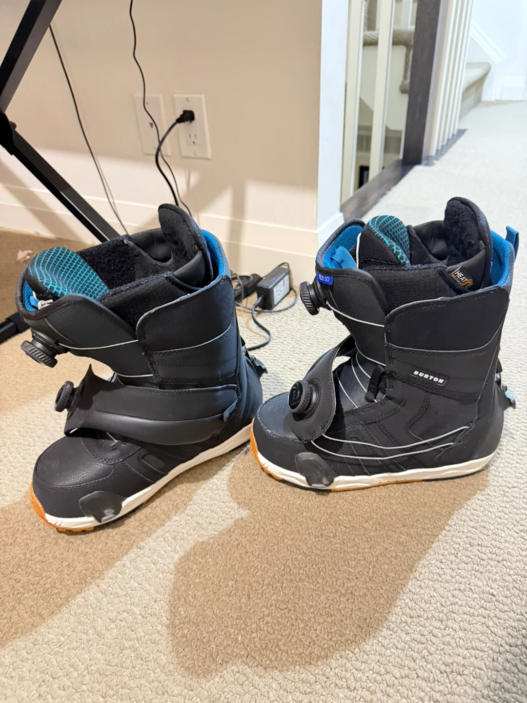 These are Burton Imprint 3 snowboard boots in black and blue. They're a size 9W and feature the Boa lacing system for a secure fit. Perfect for hitting the slopes this season! Used once