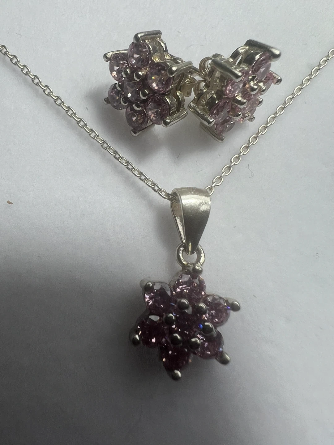 This is a lovely matching necklace and earring set. The pieces are silver and feature a floral design with pink stones. Perfect for adding a touch of sparkle to any outfit!