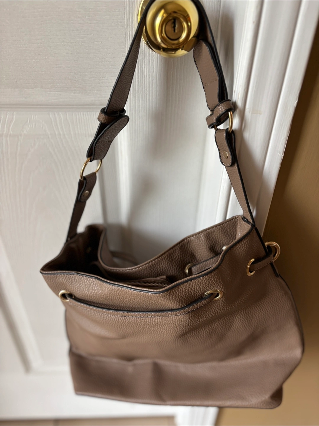 Beige coloured bag. Drawstring closure. Has a shoulder strap. Inside pockets. A perfect companion for a day out, or a gentle walk in the park. Nice roomy summer handbag that will go well with any outfit