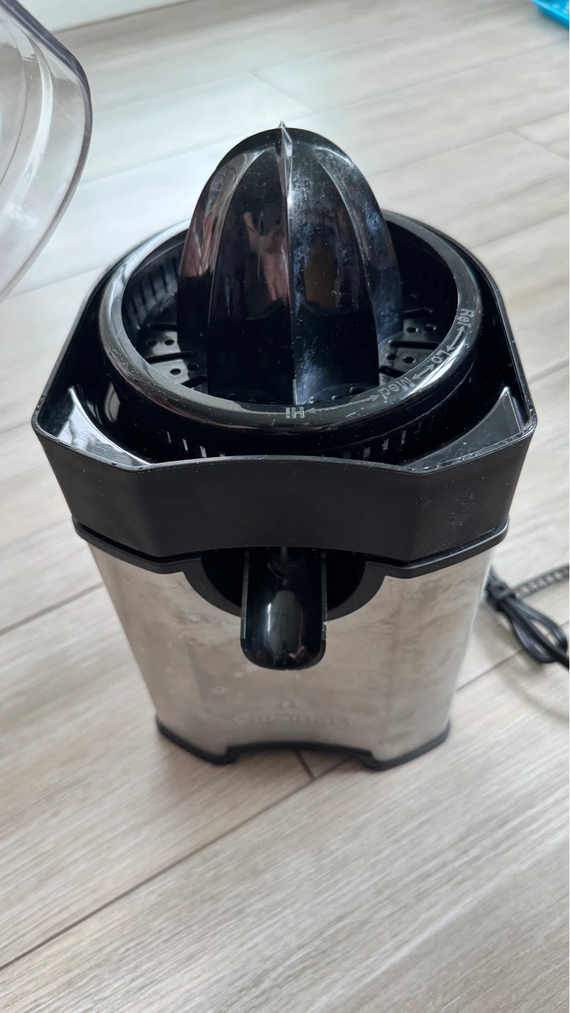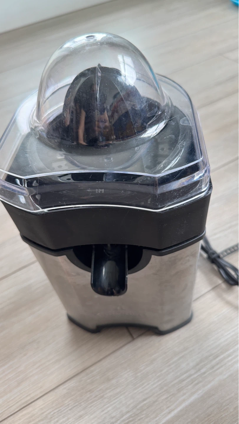 This Cuisinart citrus juicer features a stainless steel body and a clear juice spout. It comes with a reamer and a protective lid. Perfect for making fresh juice quickly!
