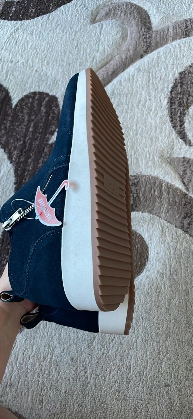 Navy blue suede ankle boots from Blondo. They're waterproof and feature a side zipper for easy on and off. The sole is a durable rubber. Not used new got the wrong size and couldn't return it.