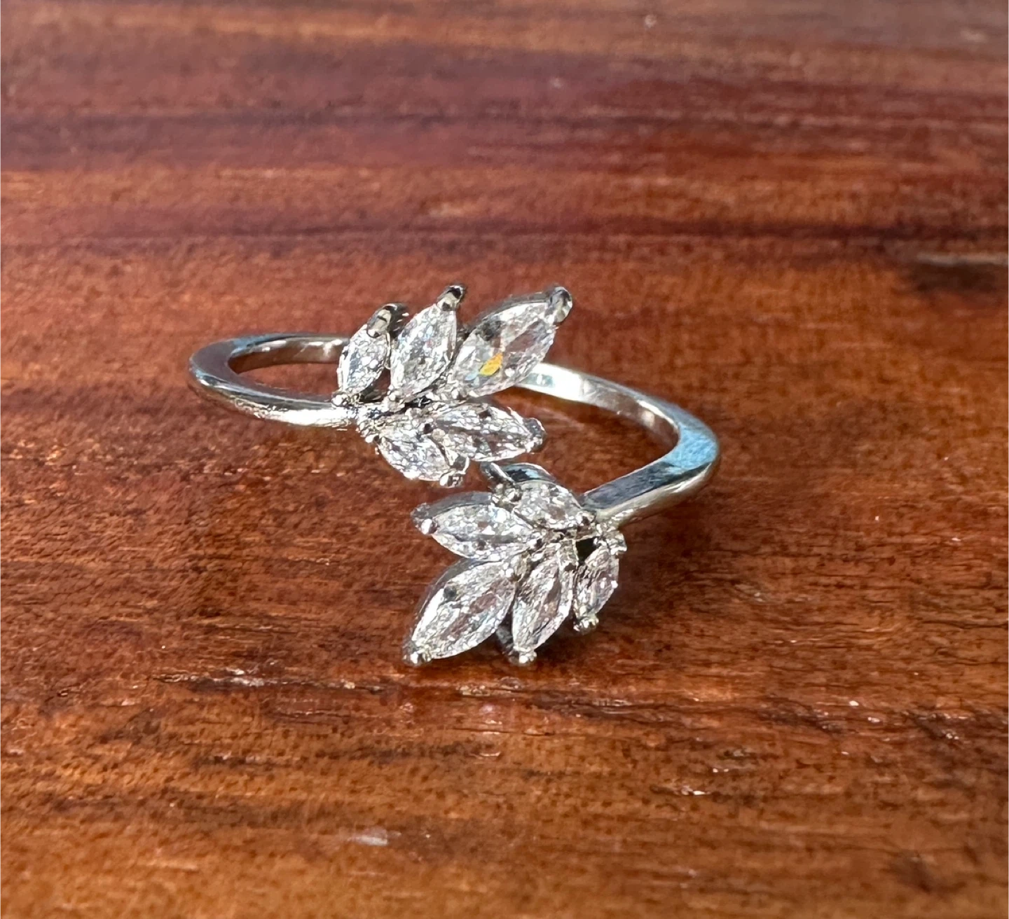 A lovely ring with a delicate leaf design encrusted with sparkly stones. It's silver-toned and sure to add a touch of elegance to any outfit. This ring would make a great gift for someone special!