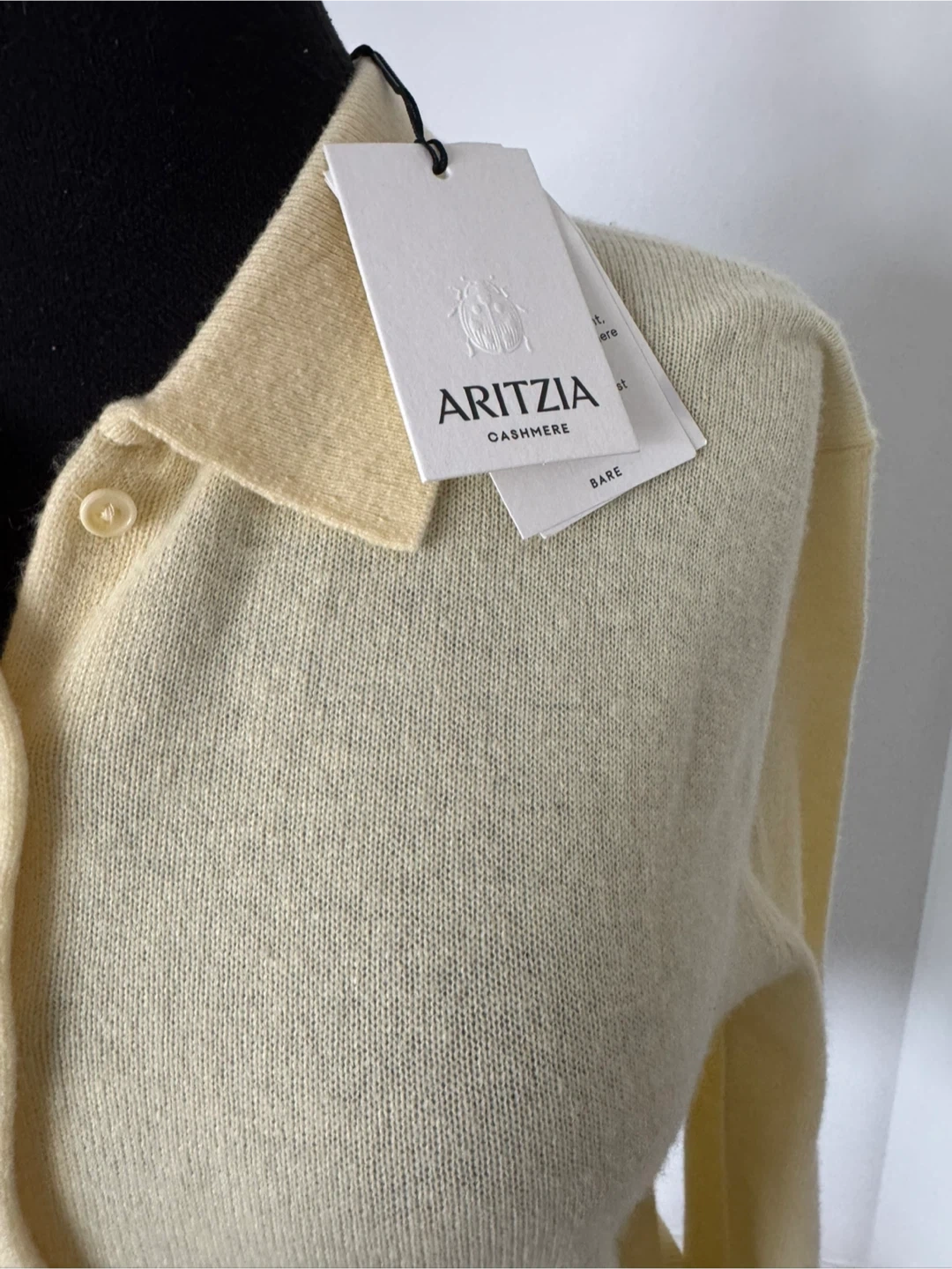 This Aritzia polo cashmere sweater comes in a lovely butter yellow shade. It's a size S/P. The material appears to be a fine knit, perfect for layering or wearing on its own. A versatile piece for any wardrobe!