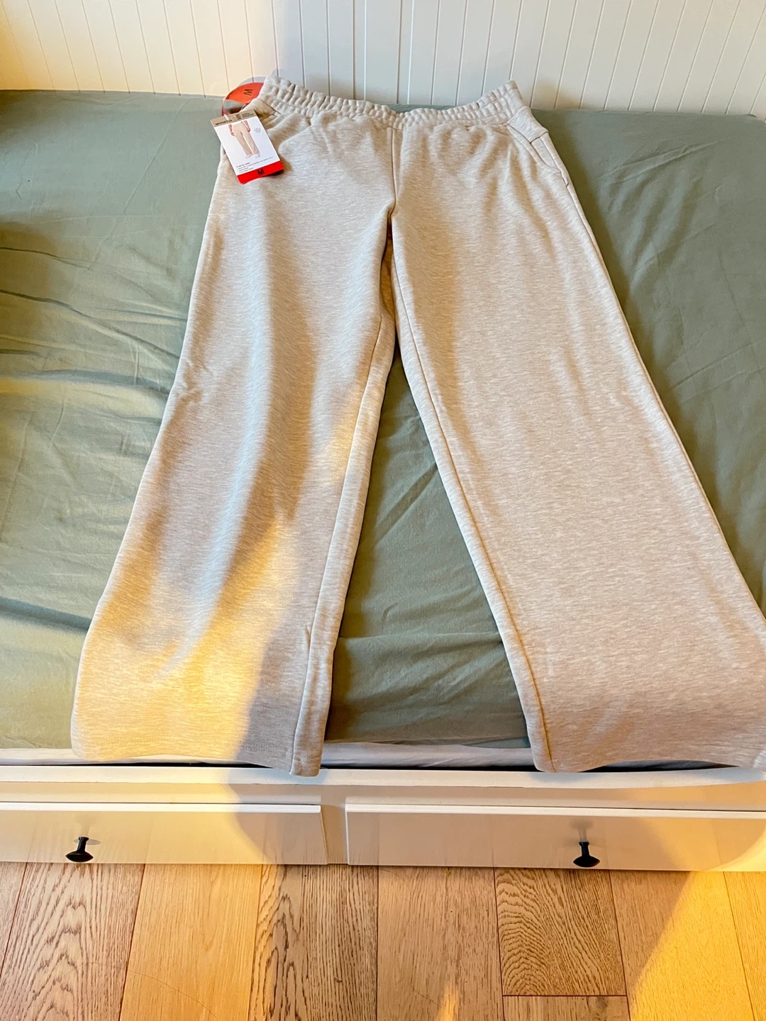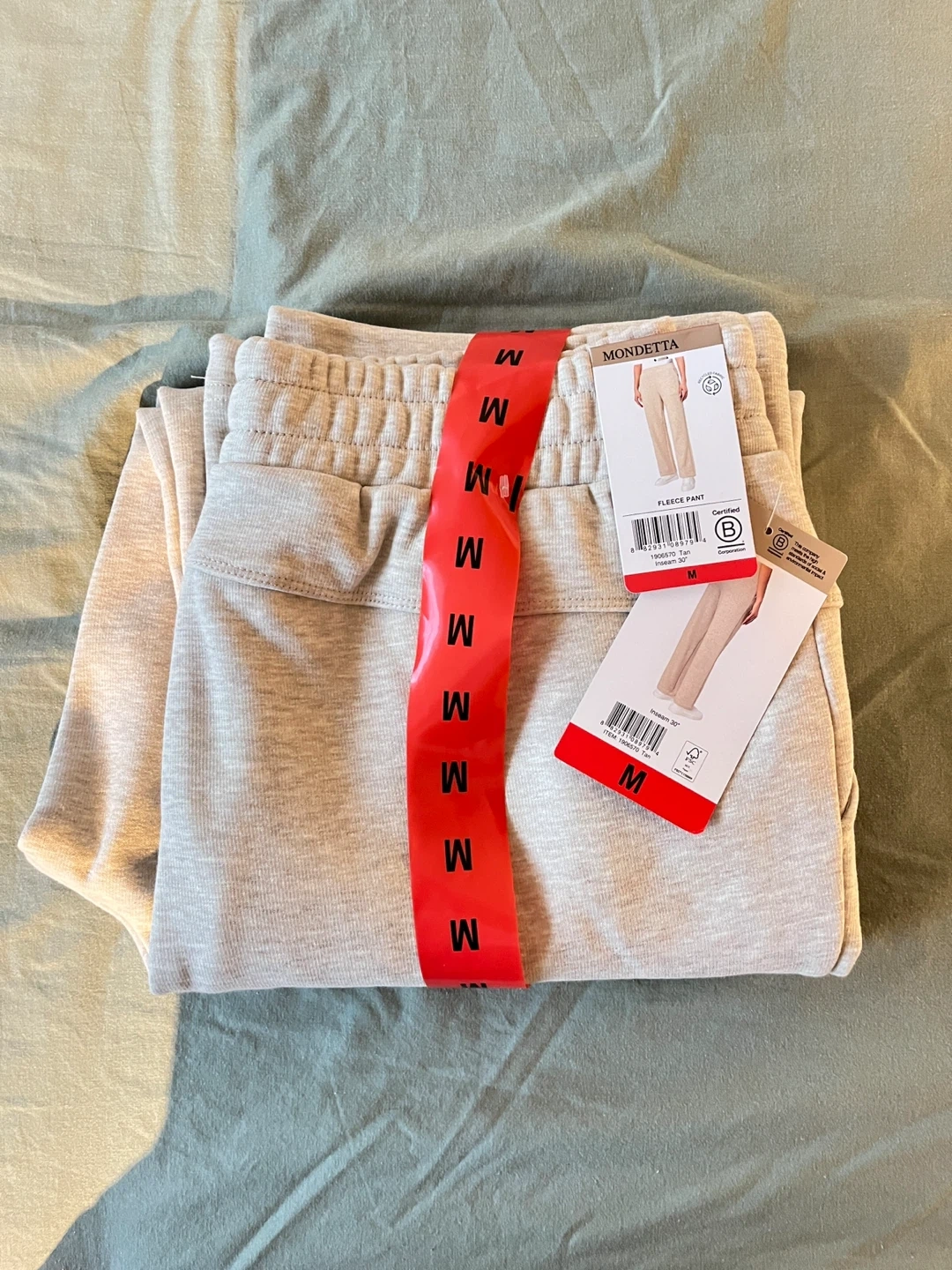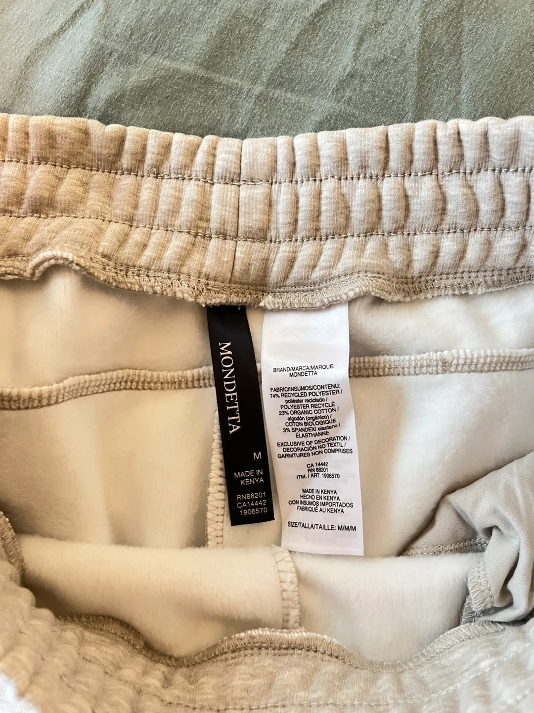These Mondetta fleece pants are brand new with tags! They're a comfy neutral colour and size medium. Made with recycled polyester and organic cotton, they also have side pockets and a cozy fleece interio.