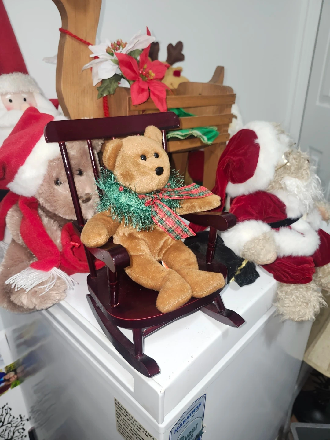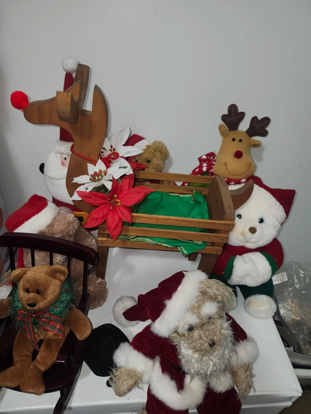A festive collection of Christmas decorations including a pinecone and poinsettia arrangement, plush Santas and bears, and a wooden reindeer sleigh. Perfect for adding holiday cheer to your home!