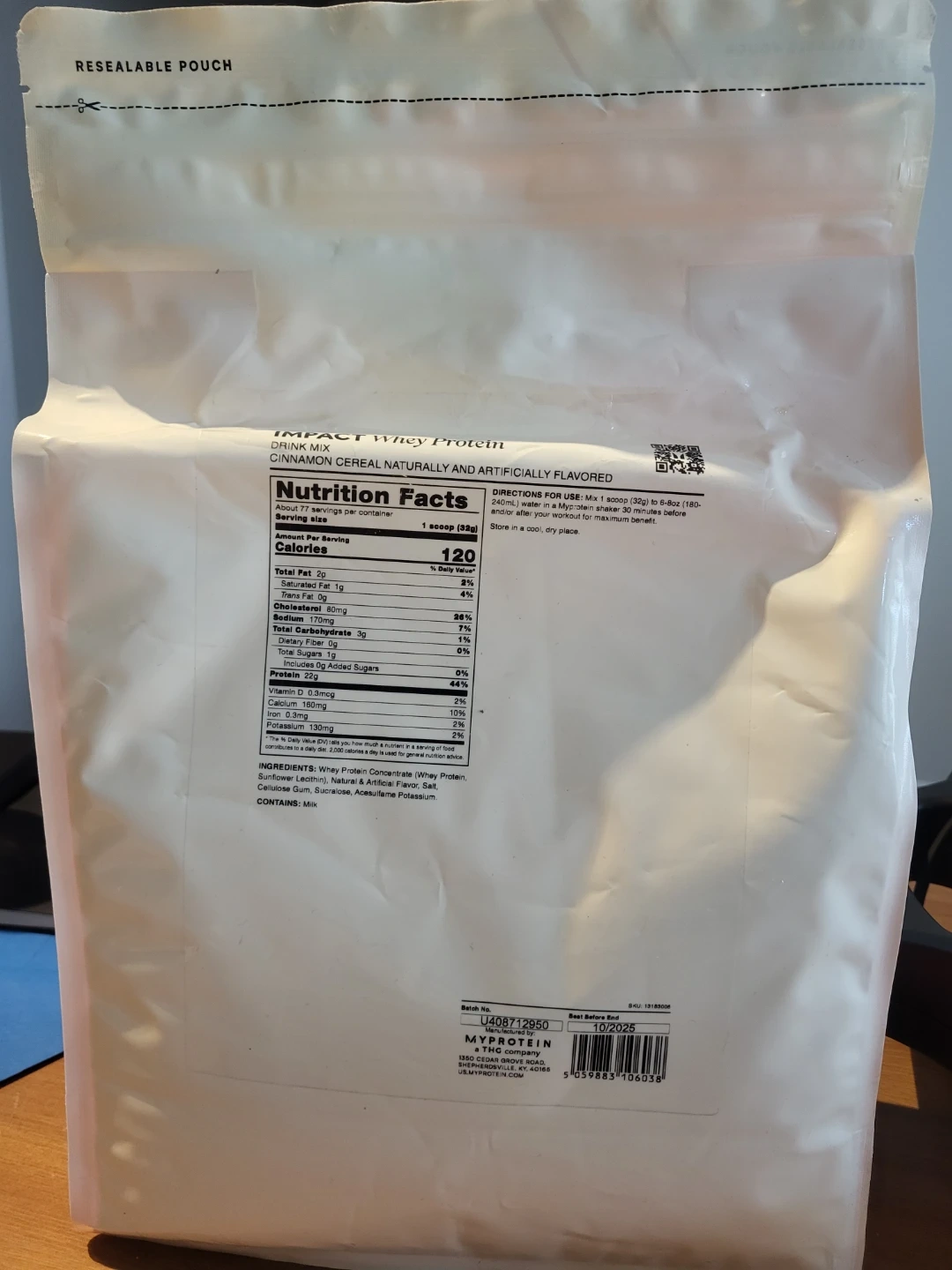 This is a 5.5lb (2.5kg) bag of MYPROTEIN Impact Whey Protein in Cinnamon Cereal flavour. 120 calories and 22g of protein per serving.