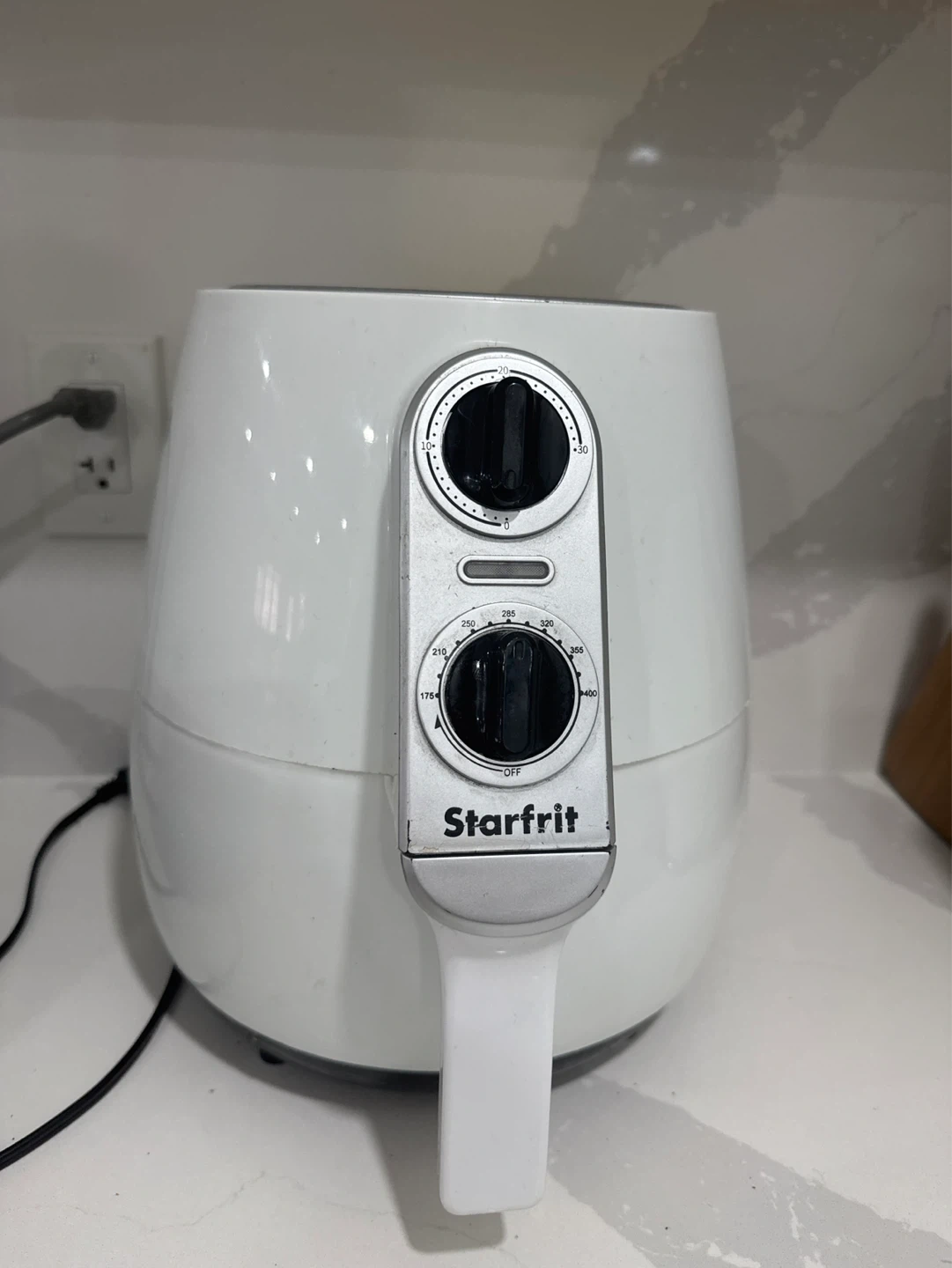 White Starfrit air fryer with temperature and timer knobs. It has a basket that pulls out for easy access. This appliance cooks food using hot air.