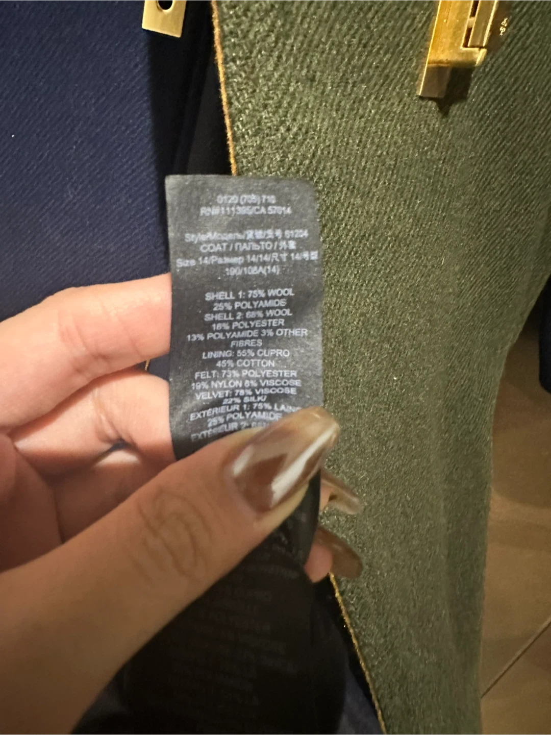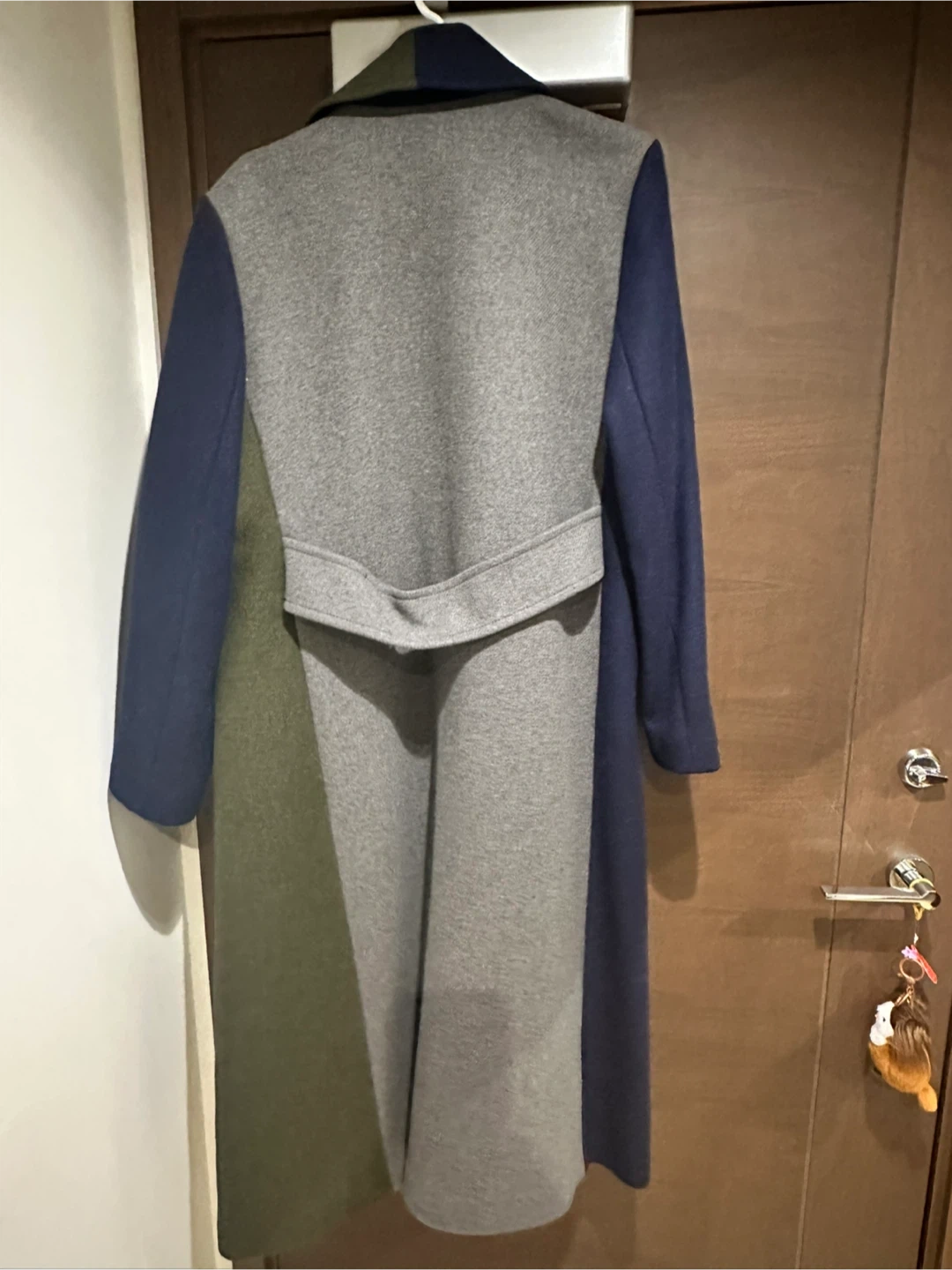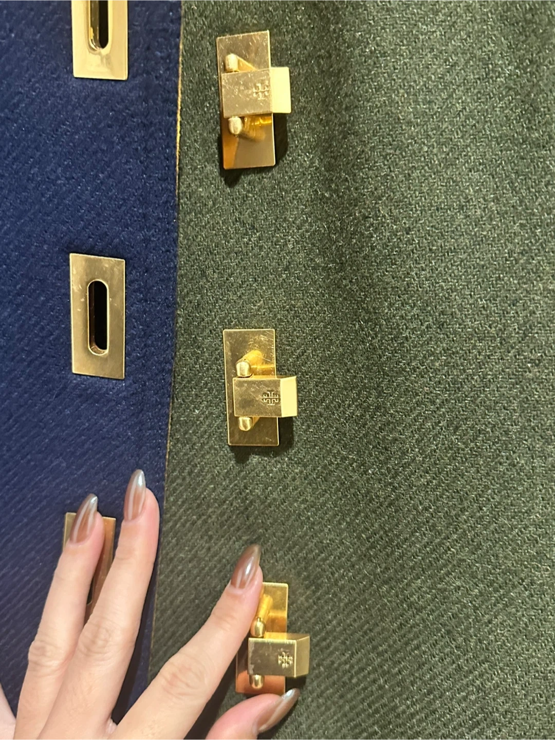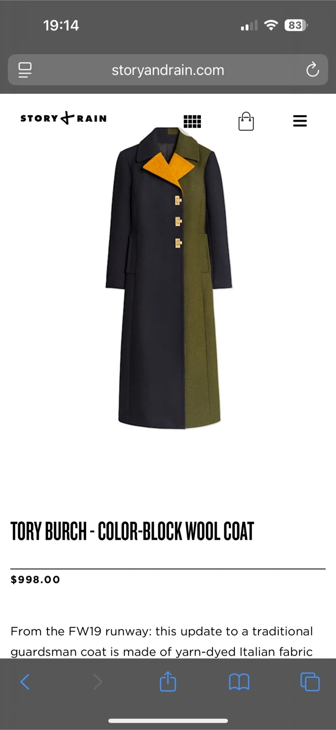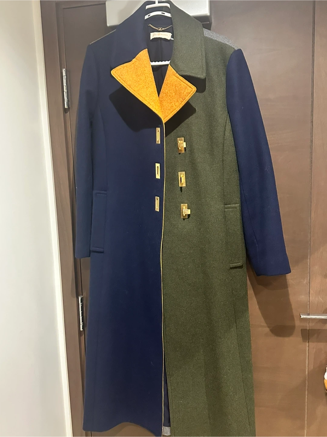 Selling a stylish Tory Burch colour block coat in size L. The coat features a unique design with a mix of navy blue, green, and grey. Very lightly worn.