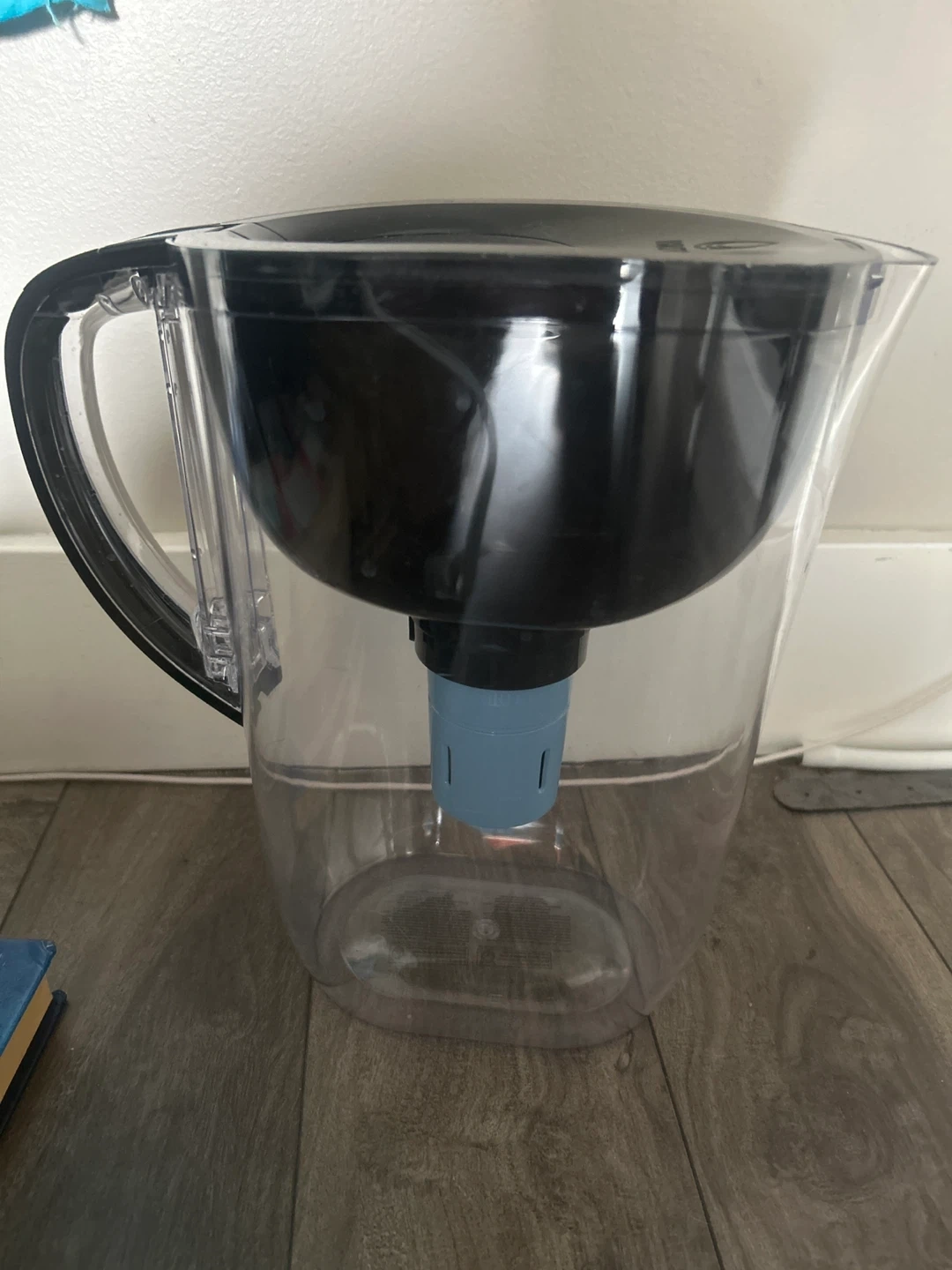 Brita water filter pitcher. It's a clear pitcher with a black lid and a blue filter housing. Great for reducing tap water impurities! Filter included ONLY tap water has been put through the filter.
