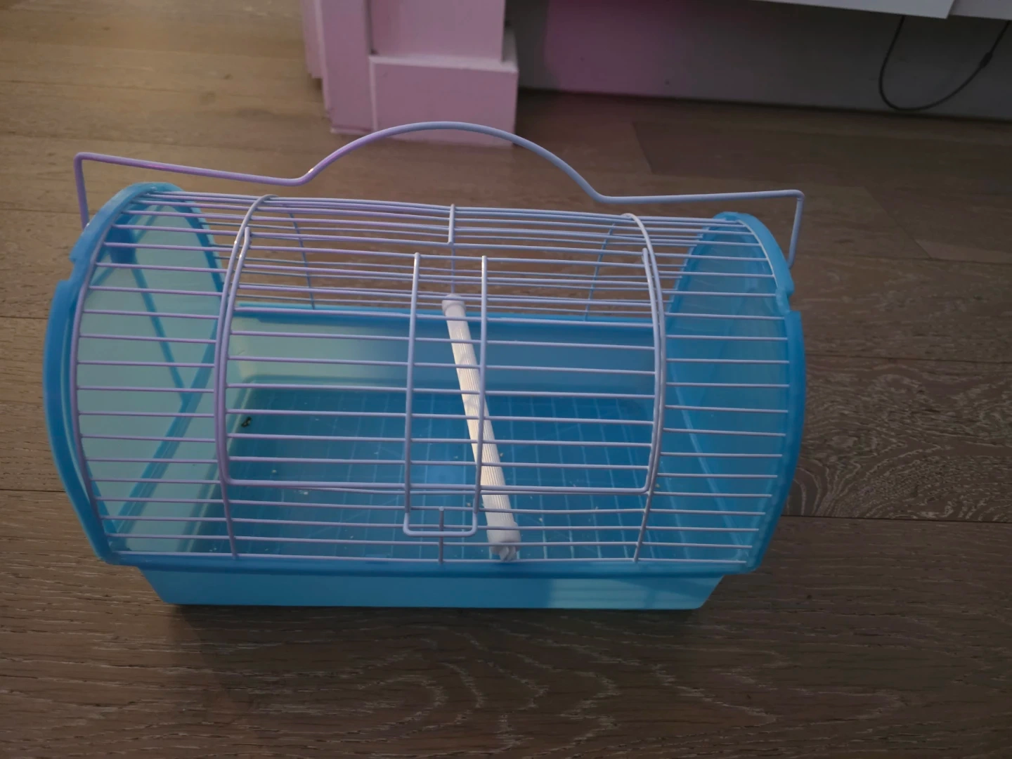This is a blue small animal cage with a wire top and plastic base. It includes a swing and a carry handle. Perfect for transporting small pets.