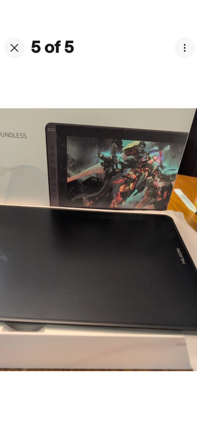 This is a Huion Kamvas 13 creative pen display. It's a drawing tablet with a screen. It comes with a pen and a drawing glove and tablet holder.