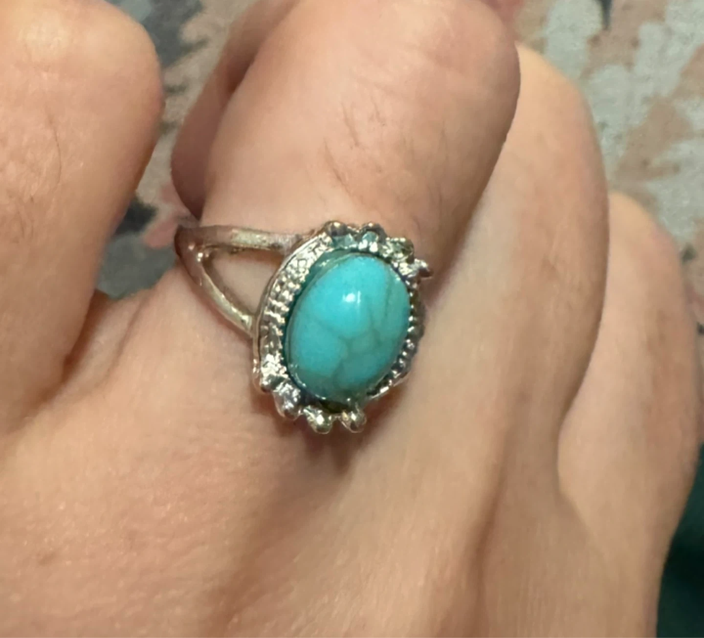 A lovely silver-tone ring featuring a vibrant turquoise stone. The setting has a decorative, slightly antiqued look. This ring's design makes it a nice accessory for everyday wear or to add a pop of colour to an outfit.