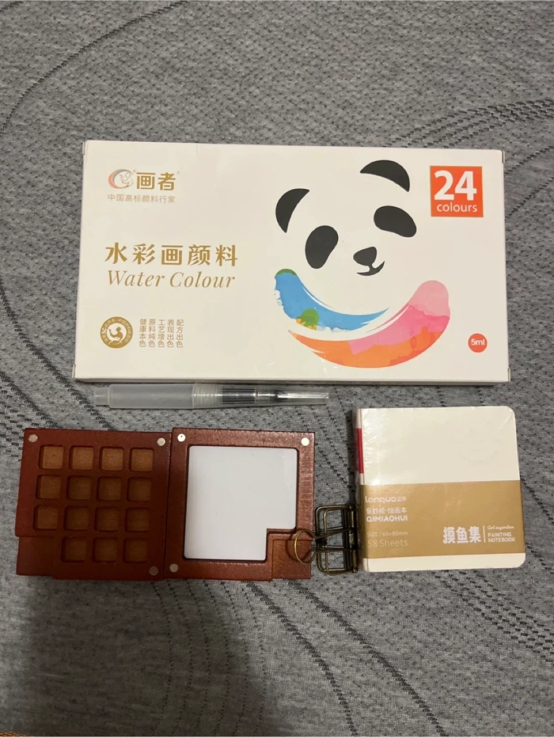 This is a mini set of 24 colours of water colour paint. It includes a water brush pen and a small watercolour notebook. The paints set are portable and convenient when traveling.