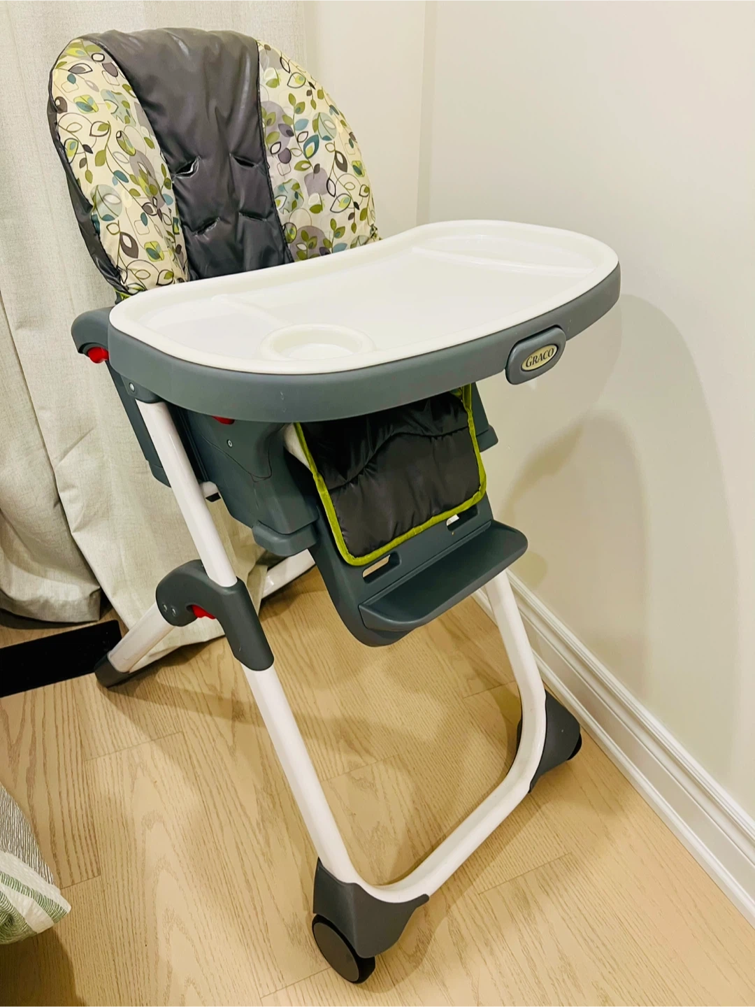Selling a gently used Graco high chair. It's in great condition and ready for a new home! The seat pad is a leafy green and grey pattern. Perfect for meal times with your little one!