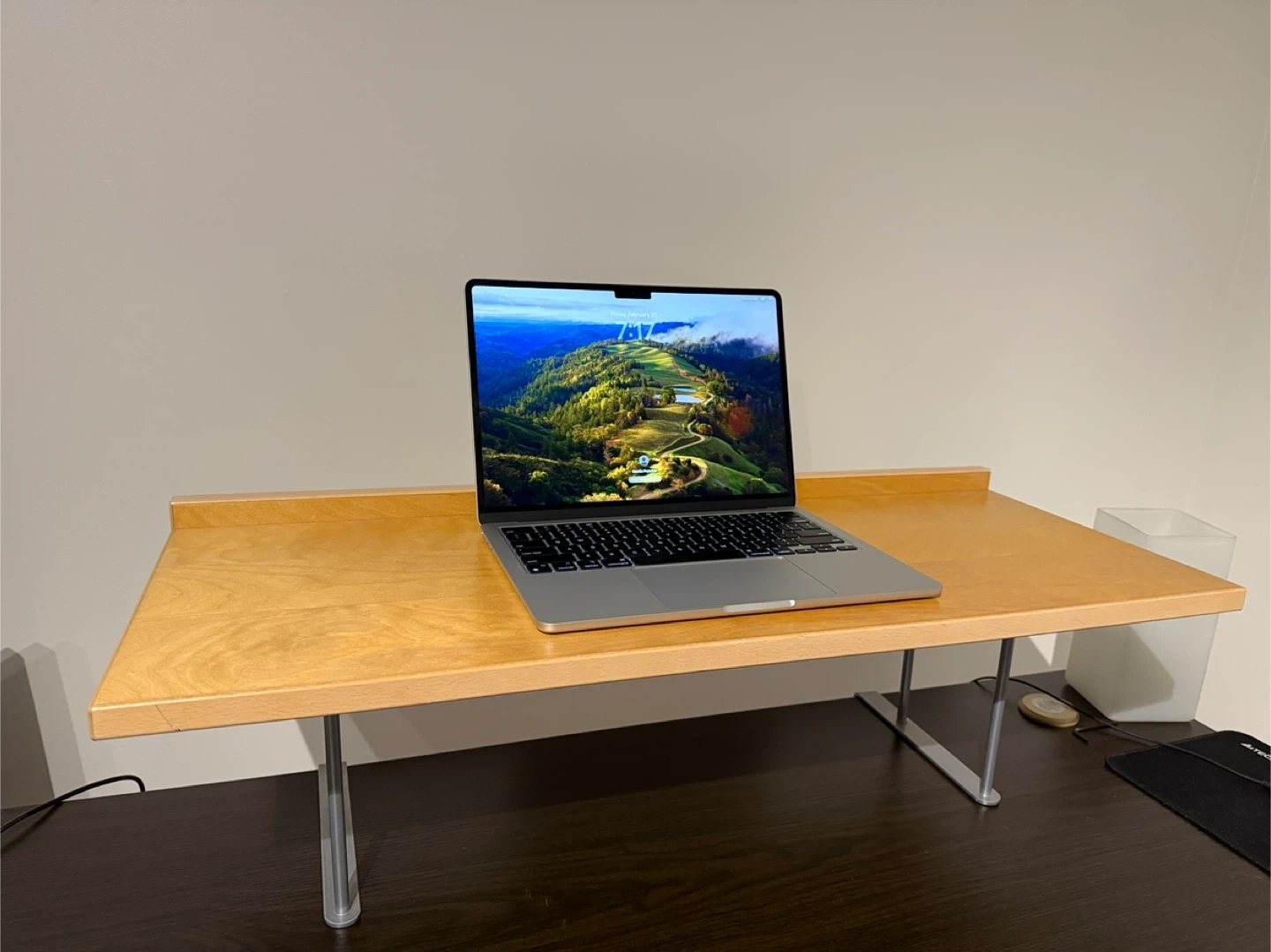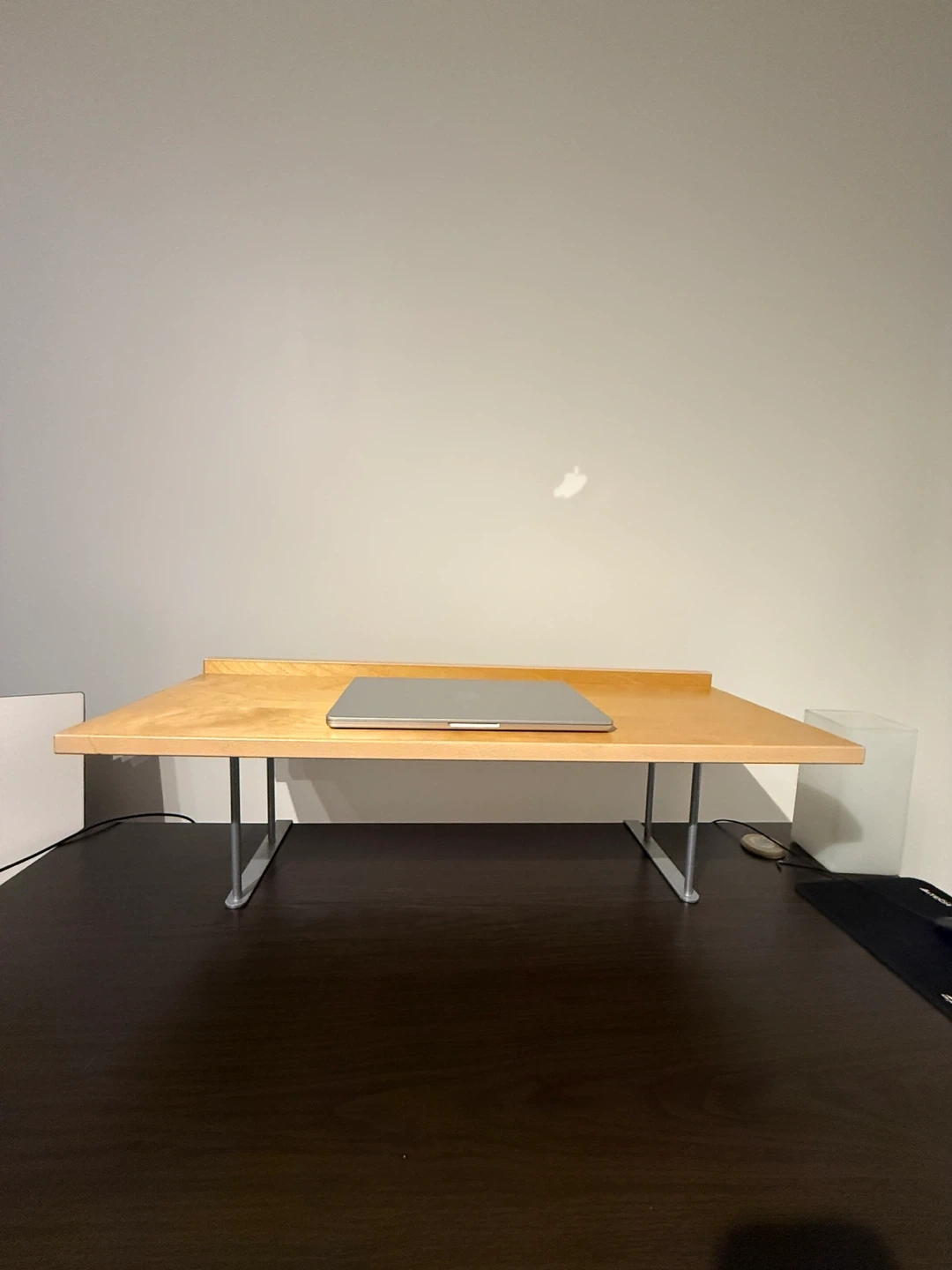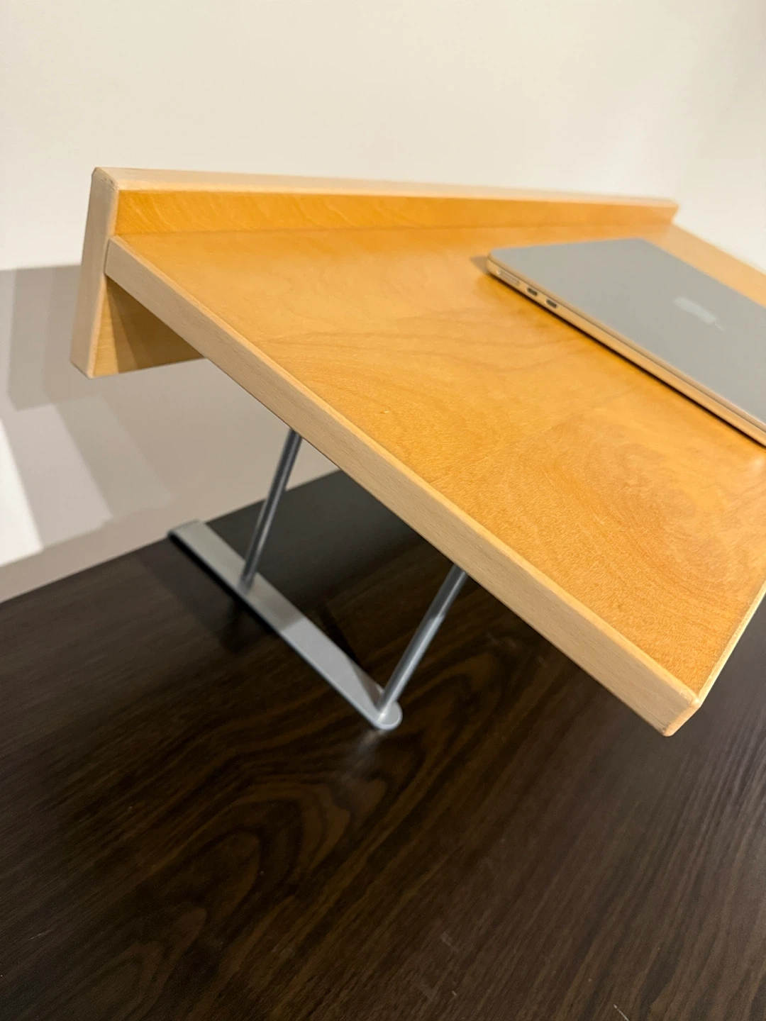 Raise your laptop for better ergonomics. This wooden stand has a light wood finish and metal legs. It's a simple and stylish way to improve your desk setup. This stand is great for elevating your screen to eye level. It measures 22" wide by 11" deep.