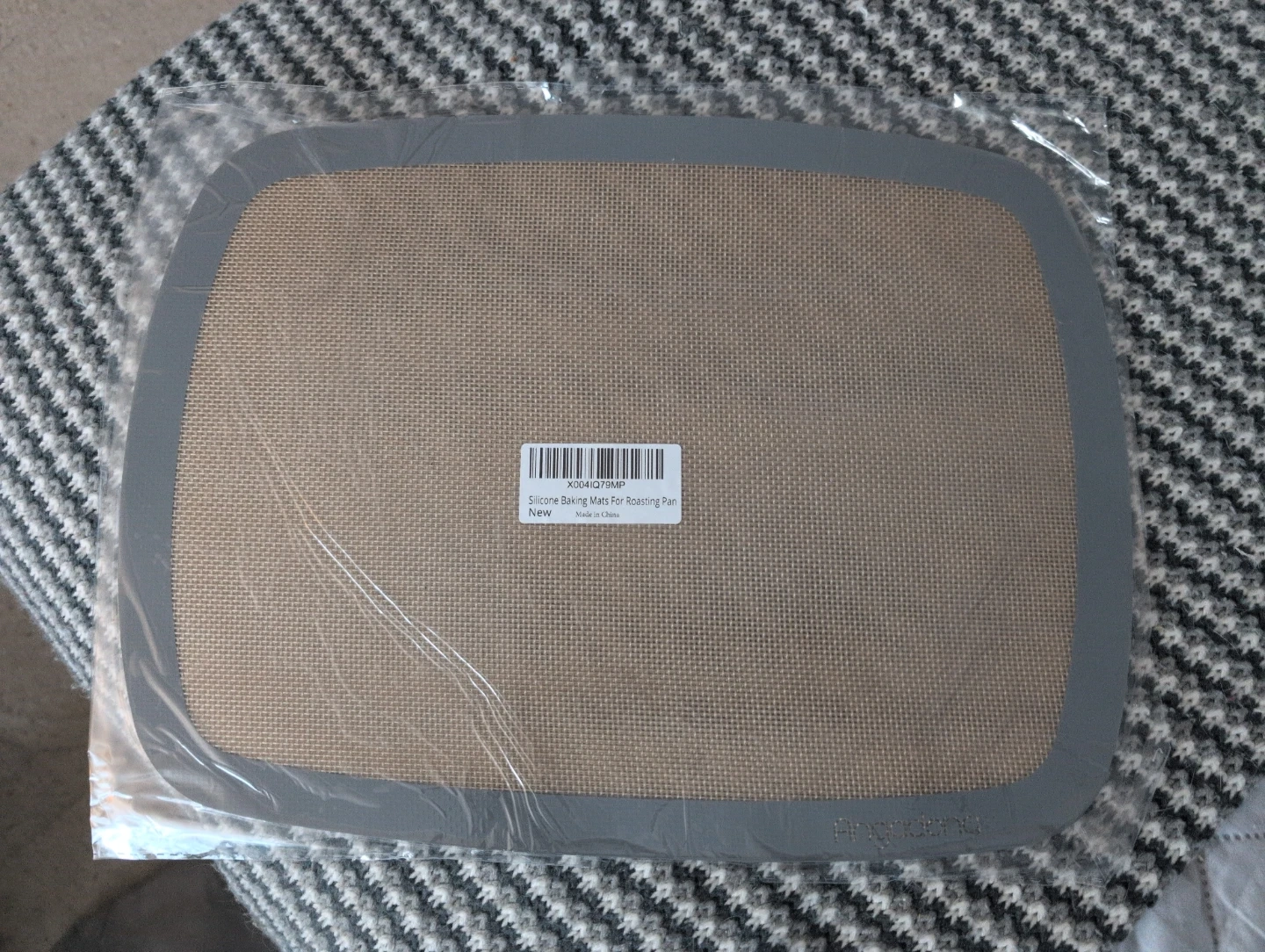 These baking mats are made of silicone for easy cleanup and non-stick cooking. They're designed for use in roasting pans, preventing food from sticking. The mats are grey and tan. 2 pc set. New similar sets retail for 16.00