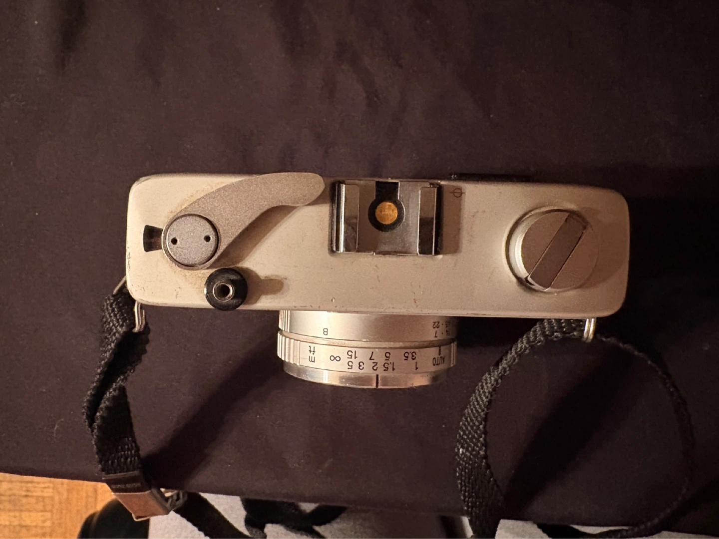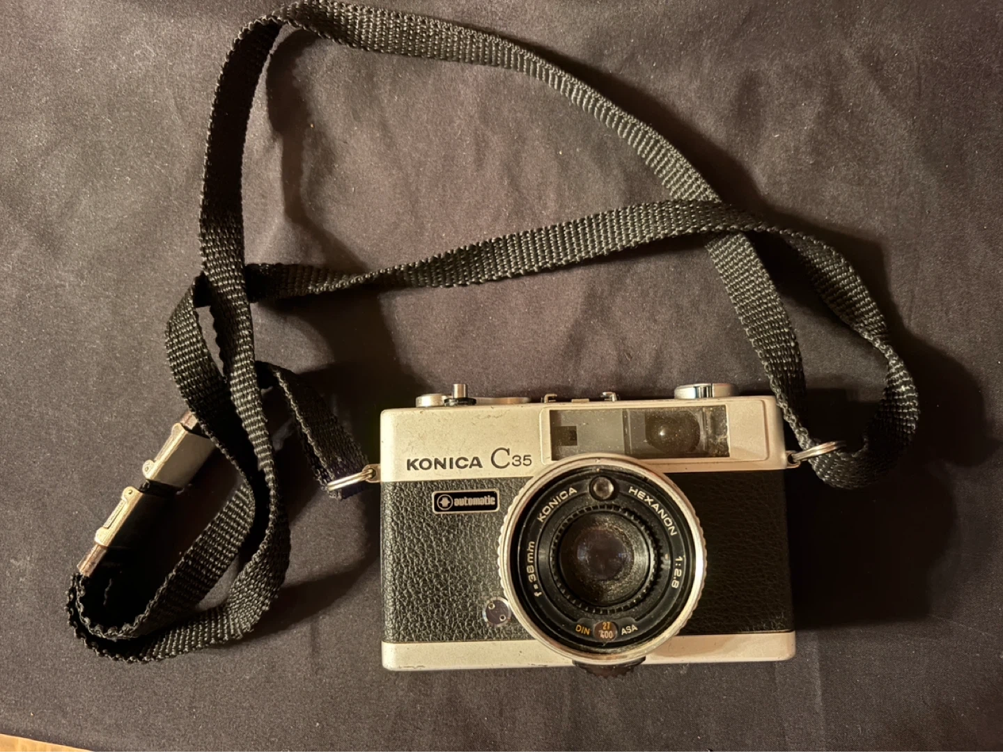 Classic Konica C35 Automatic camera with a Hexanon 38mm 1:2.8 lens. It features a pop-up film advance lever and a hot shoe for accessories. This camera's compact design makes it a breeze to carry around.