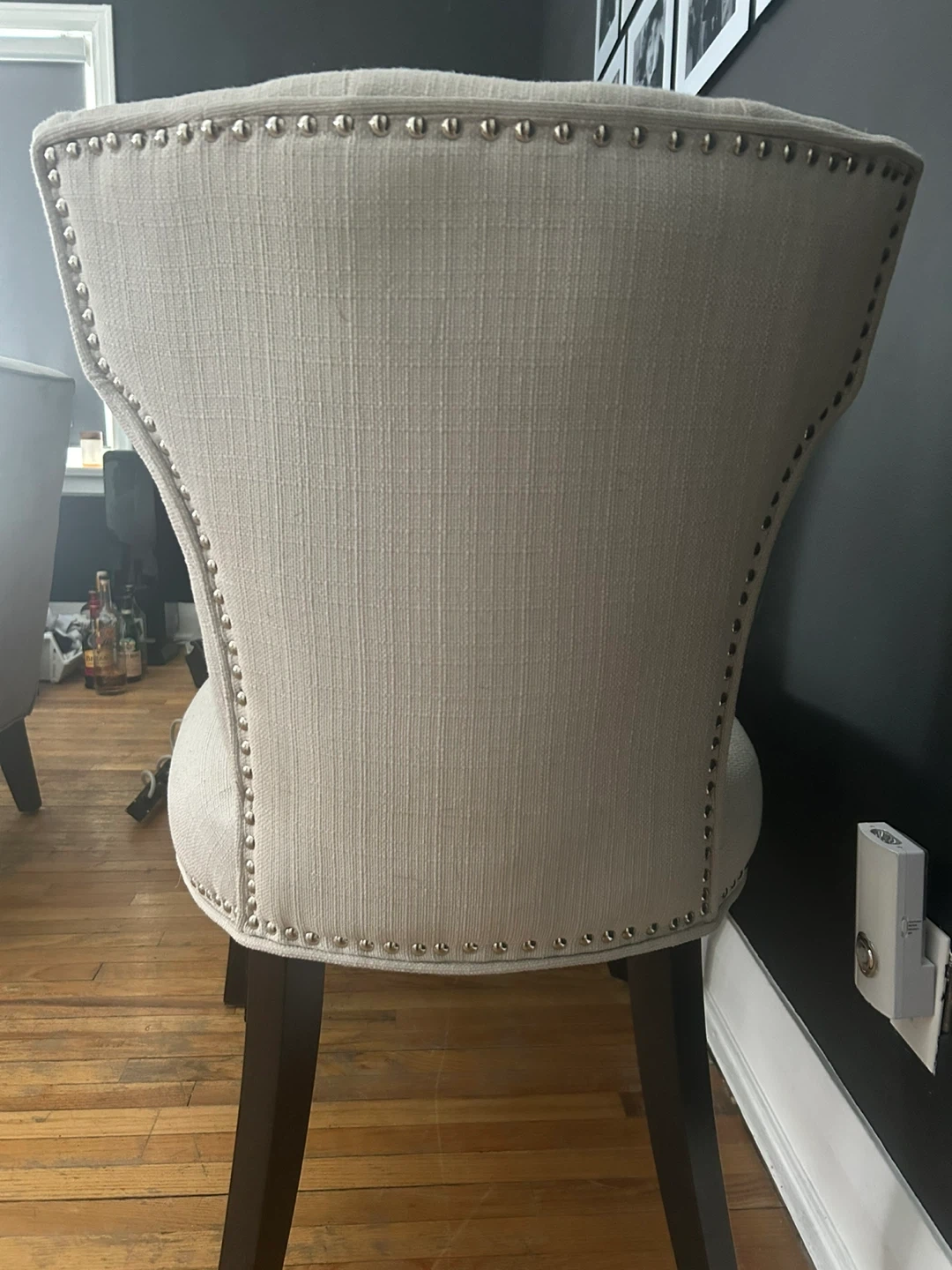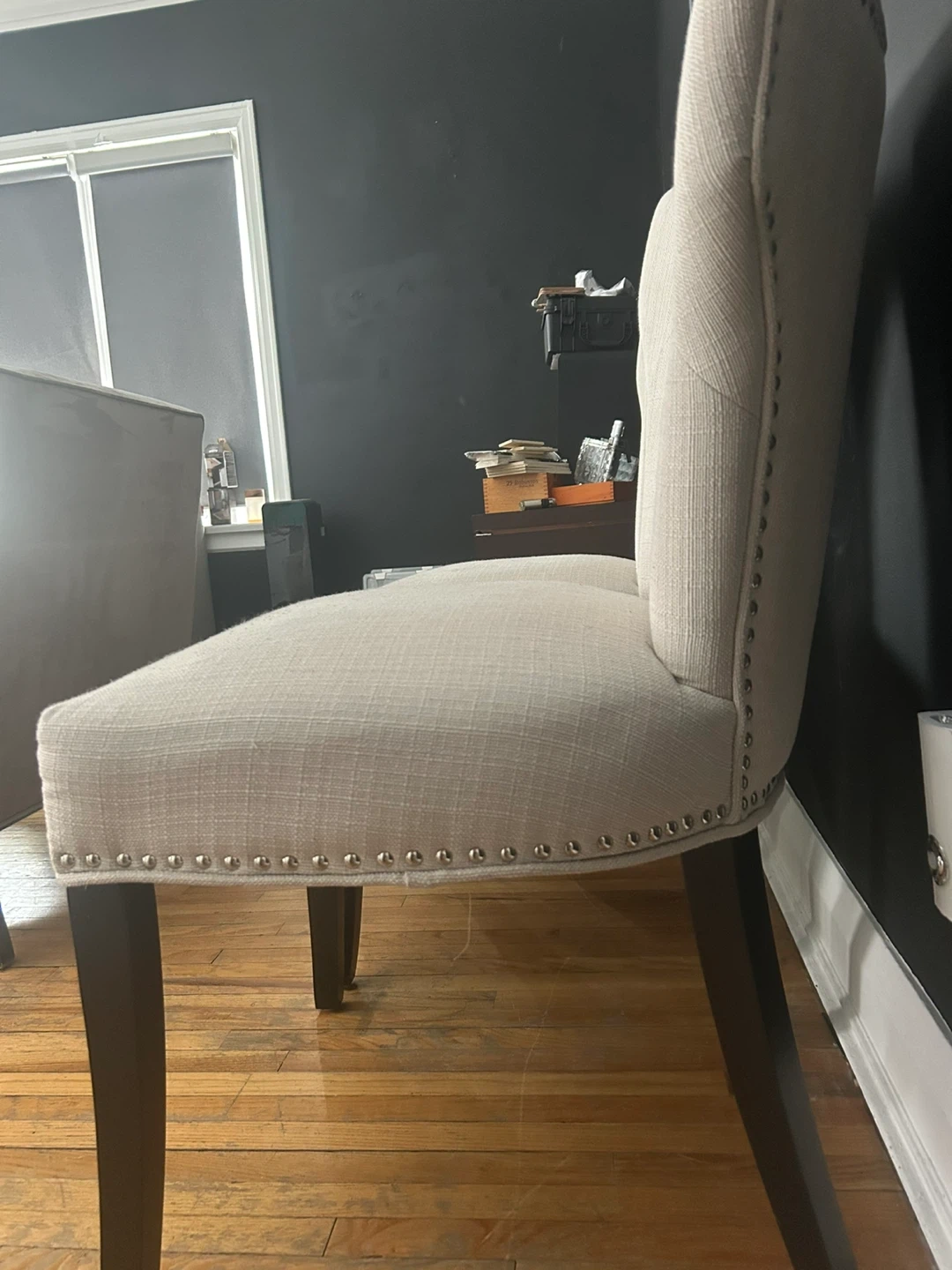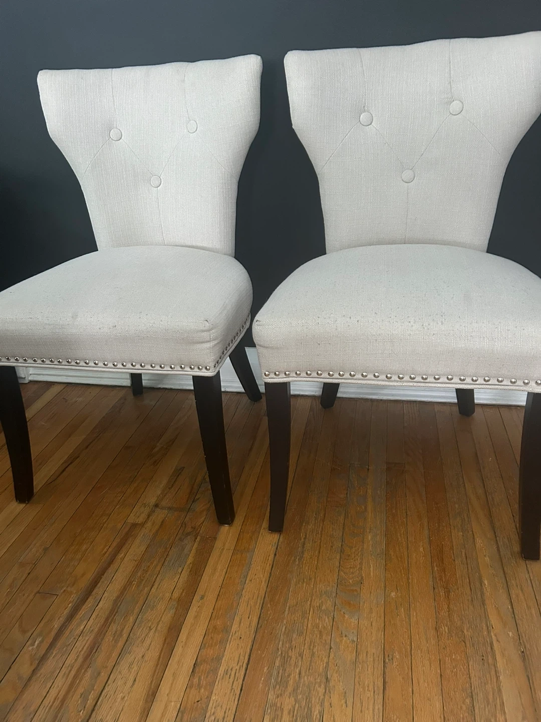 Set of two upholstered dining chairs with button tufting on the back. These chairs have nailhead trim detailing along the seat and back. They feature dark wood legs and a neutral linen-look fabric. Price is $70.