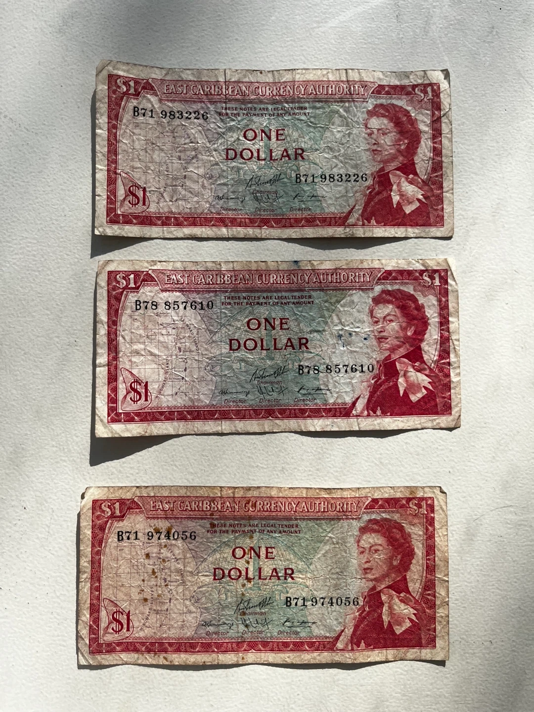 Three $1 banknotes from the East Caribbean Currency Authority 1965. Features a palm tree and island scenery on one side, and a portrait on the other. These are legal tender notes for the payment of any amount. Great for collectors!