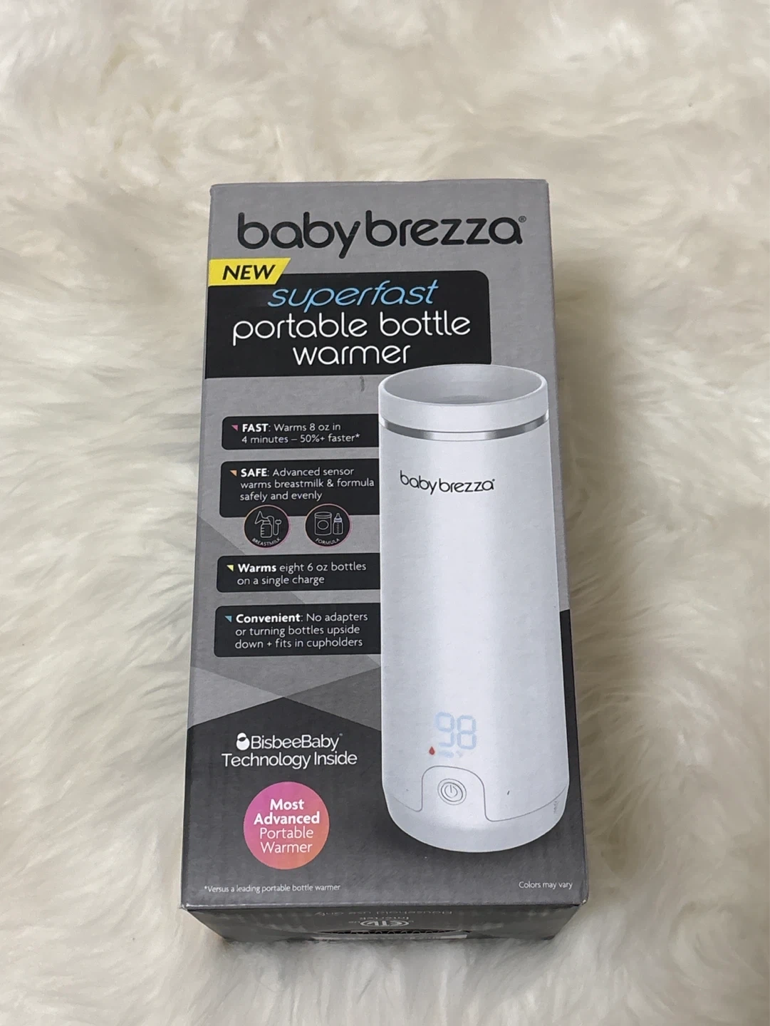 This Baby Brezza Superfast Portable Bottle Warmer is designed for warming bottles on the go. It warms 8 oz in 4 minutes. Features advanced sensor warming and is rechargeable. It fits in cupholders and can warm up to eight 6 oz bottles on a single charge.