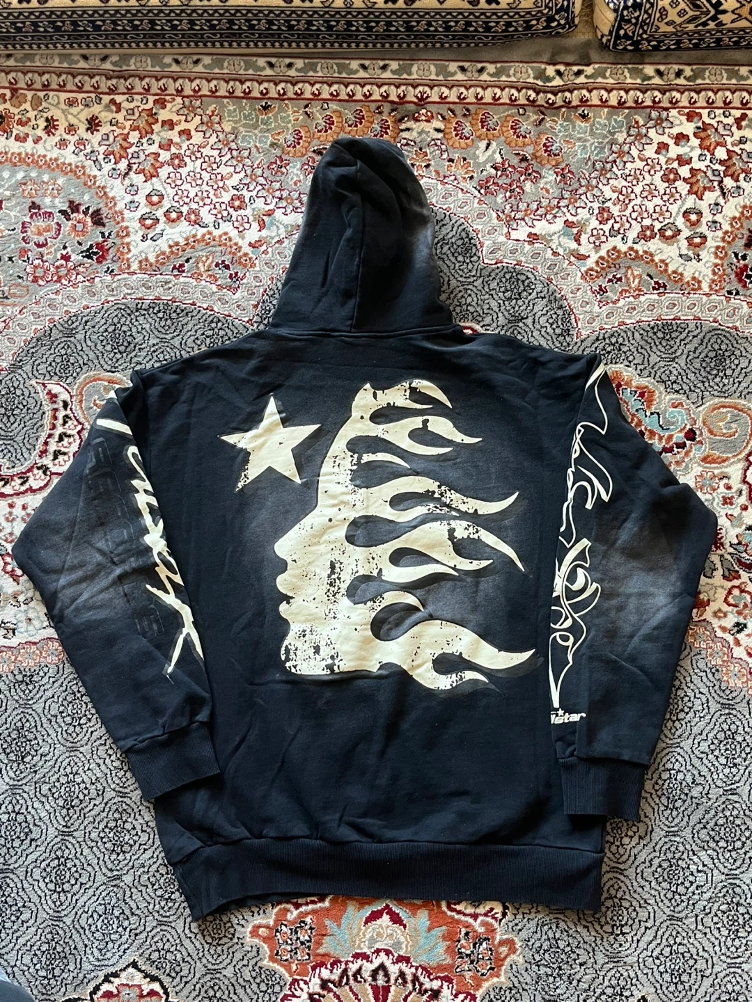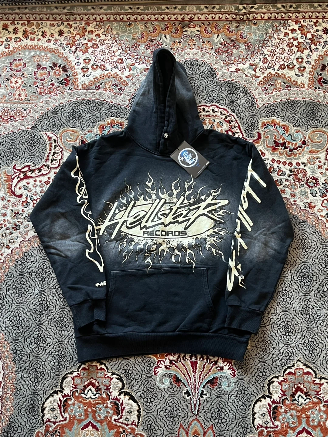 Black Hellstar Records hoodie with graphic print on front and back. Features flame and face graphics. Long sleeves and front pocket. Cotton material.