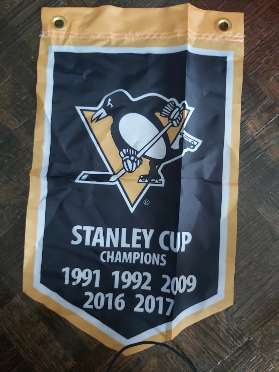 This pennant celebrates the Pittsburgh Penguins' Stanley Cup championship wins. It features the iconic team logo and lists the years 1991, 1992, 2009, 2016, and 2017. Made of fabric with grommets for hanging.