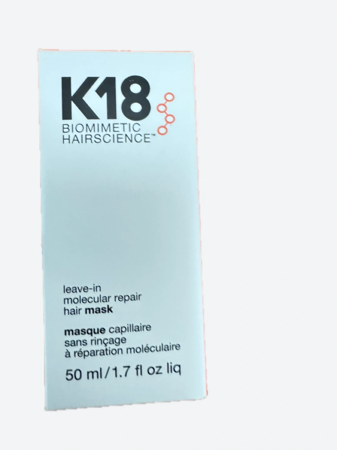 K18 Biomimetic Hairscience leave-in molecular repair hair mask. It's a 50 ml/1.7 fl oz liquid. This product is for molecular hair repair.