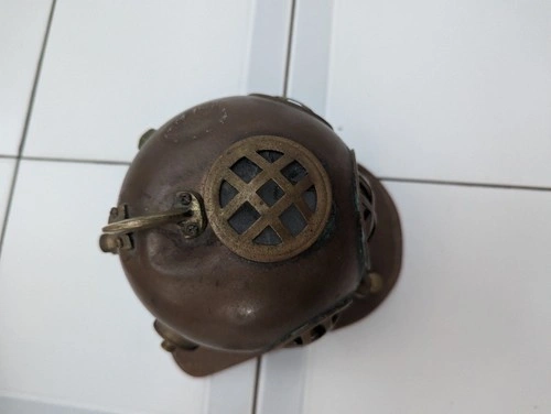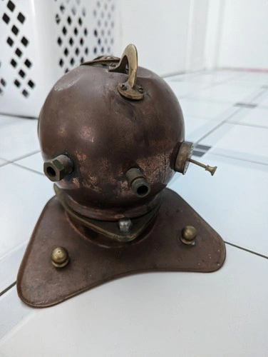 This is a replica of a copper and brass deep sea diving helmet, perfect for steampunk or marine decor. It measures 7 inches.