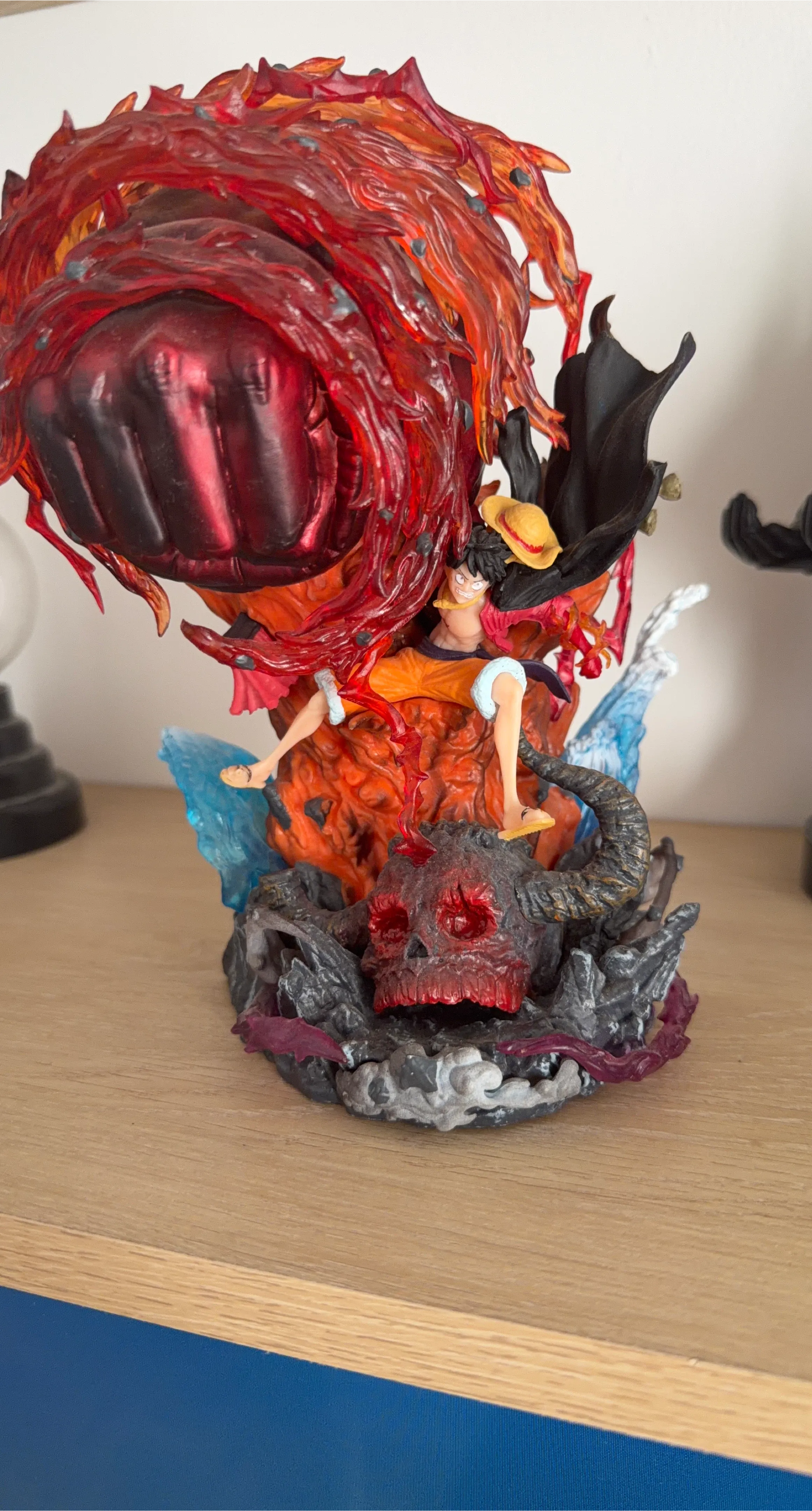 This is a detailed action figure of Monkey D. Luffy from One Piece, depicting him in his Gear 4 form. The figure features dynamic sculpting with fiery effects and a skull base. It's made of durable plastic.