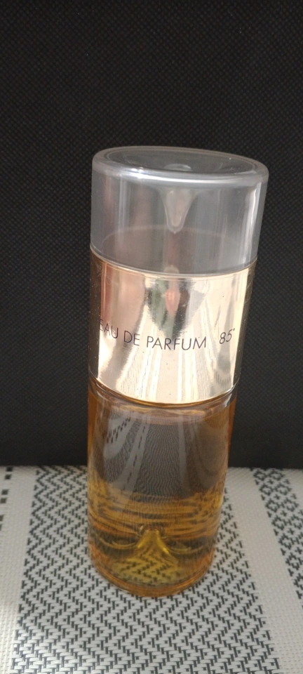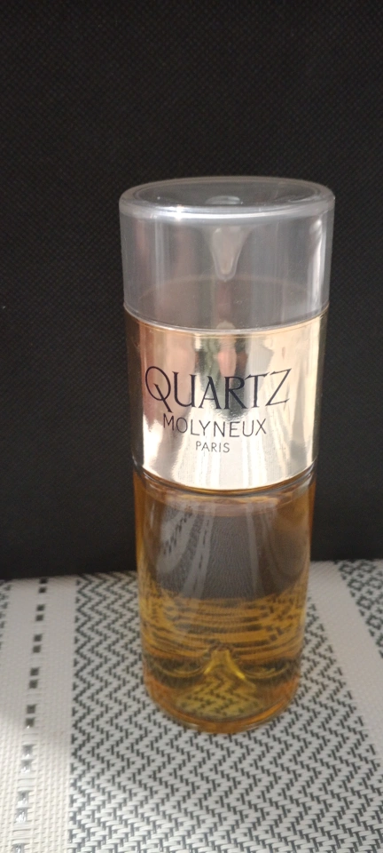 Vintage Molyneux Quartz Eau de Parfum, 85ml. Gold-labelled bottle, clear plastic cap. Great addition to any perfume collection.