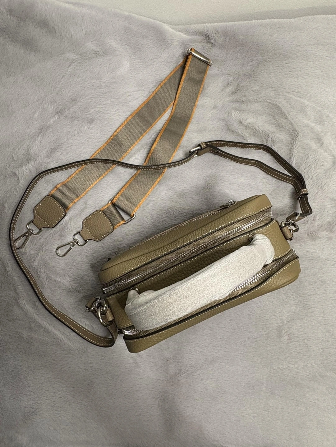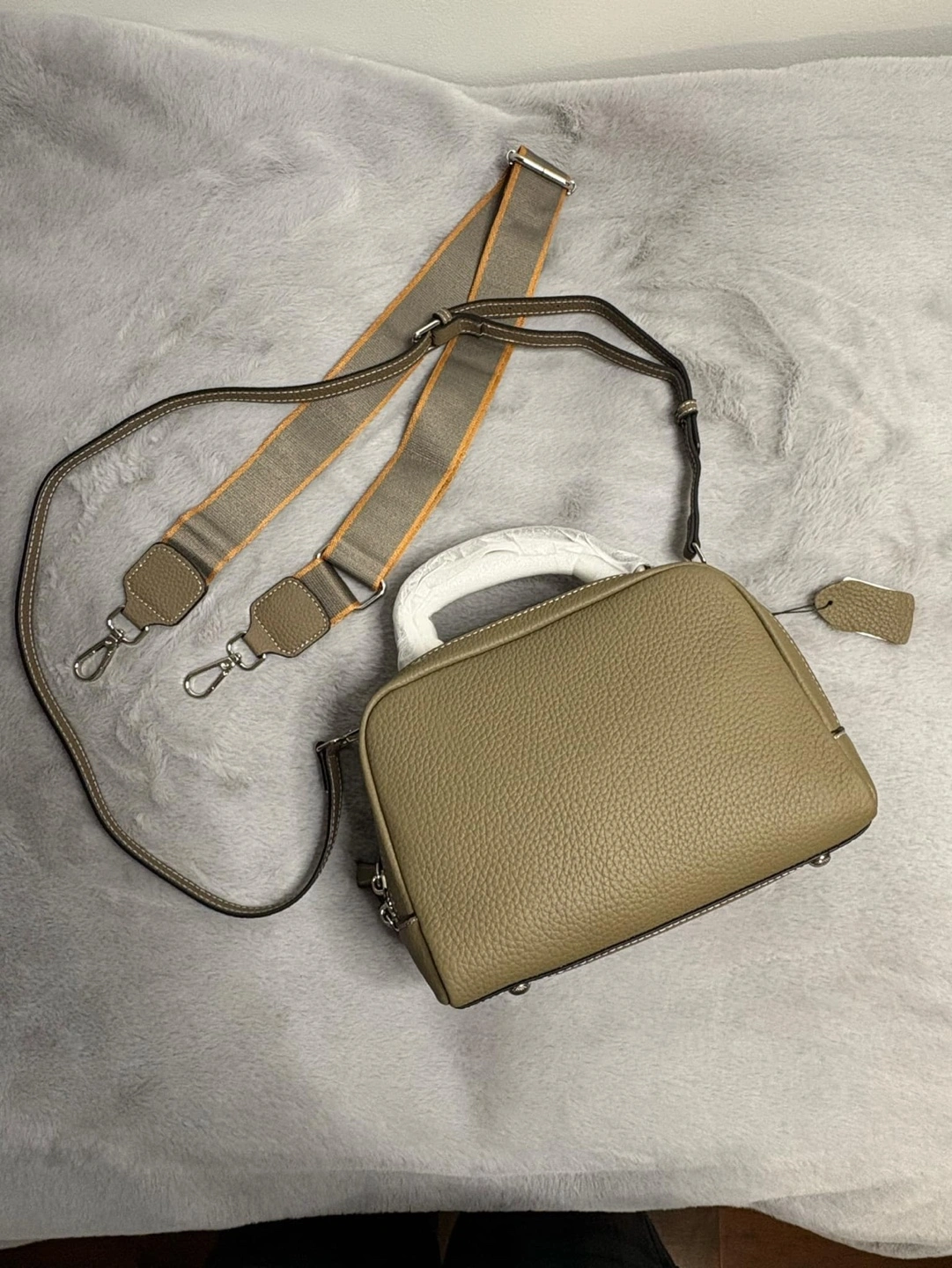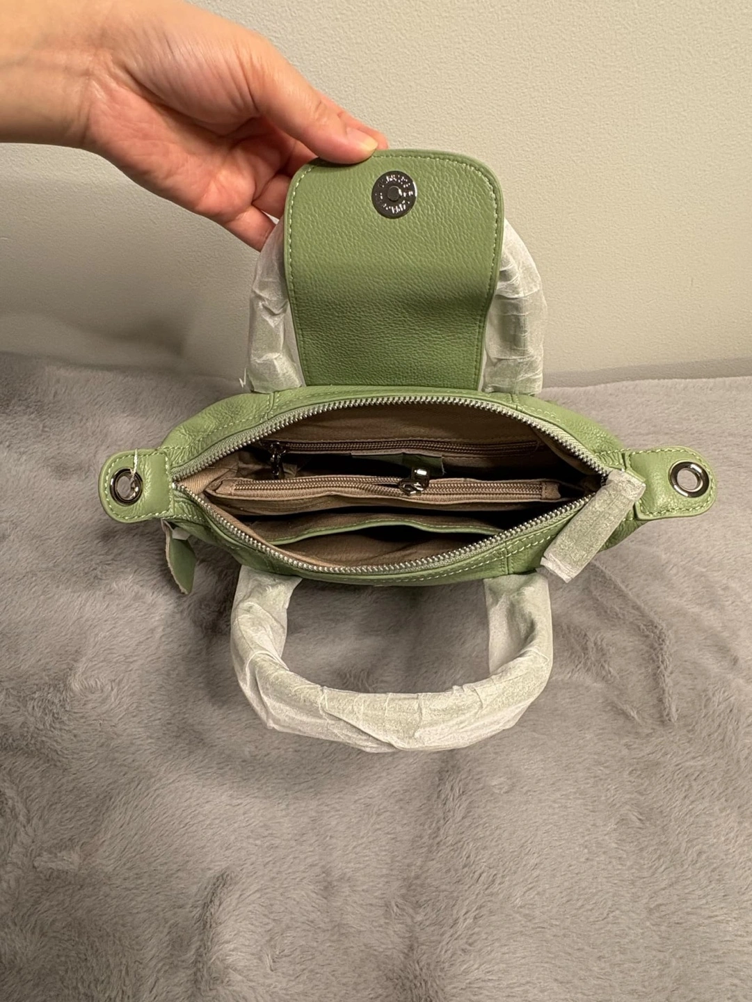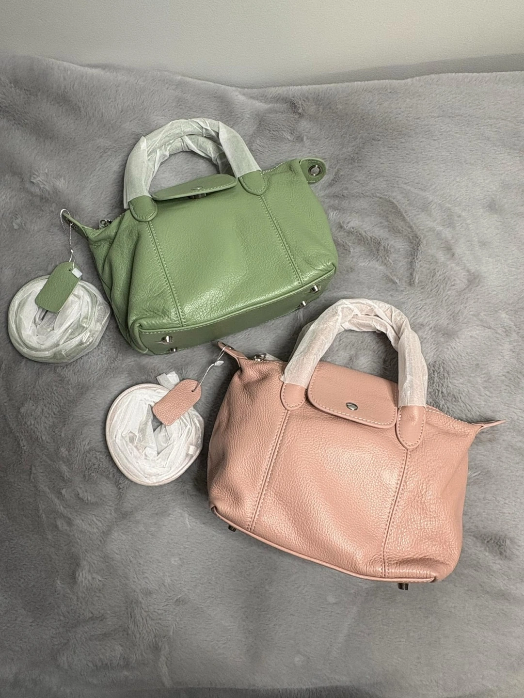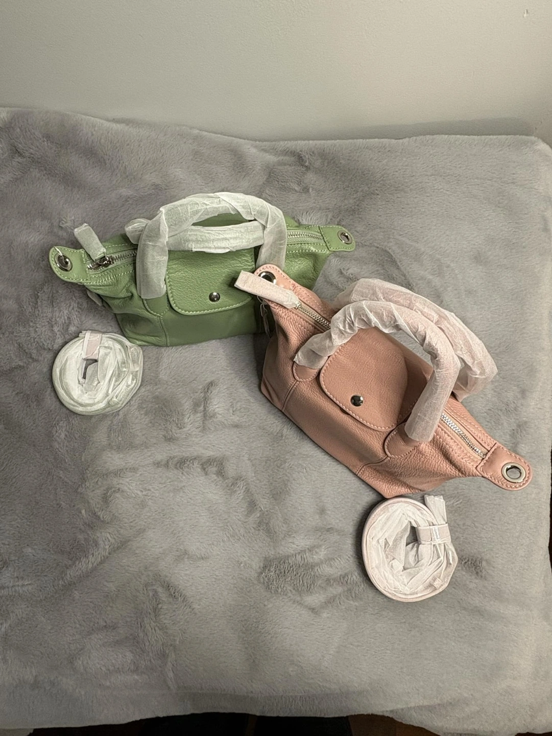 Real cowhide leather purses. One in pale green, one in blush pink and grey. Straps all included. Each features a top zip closure, single top handle, and detachable strap. Interior pockets included. Never used, still in protective packaging. $ 120 each