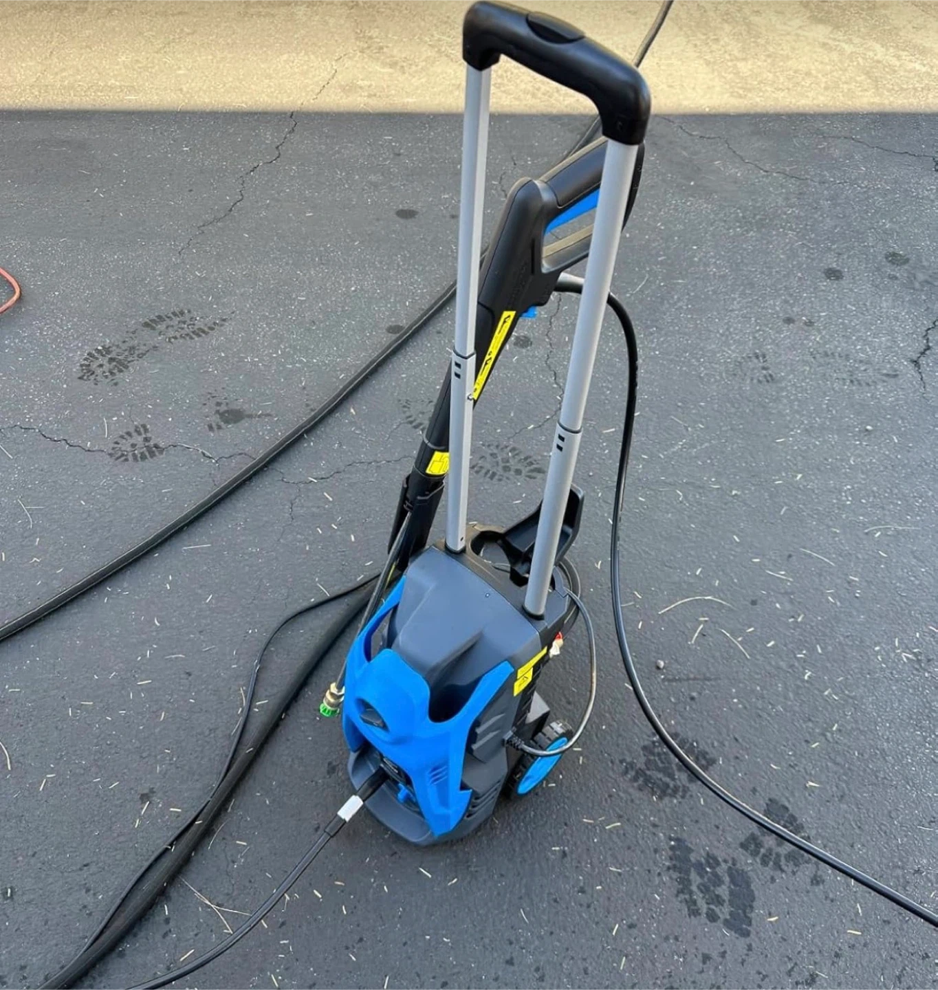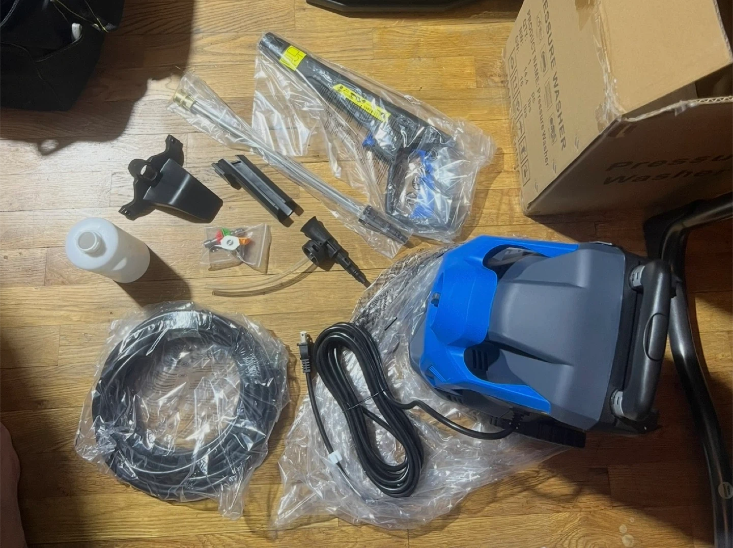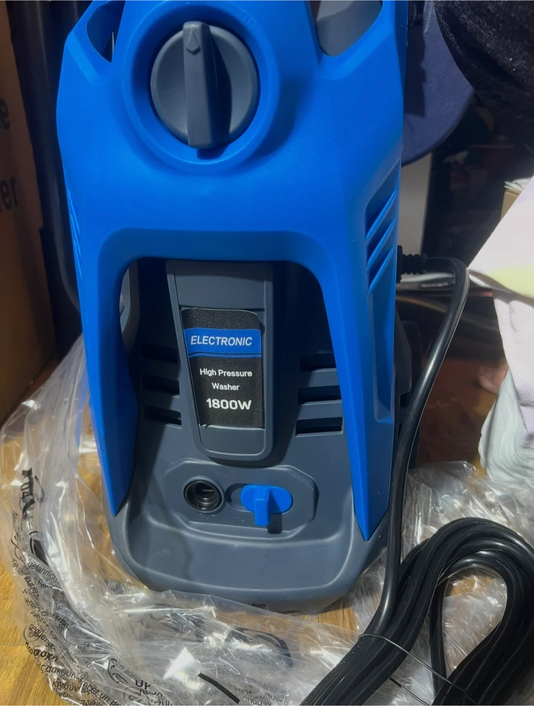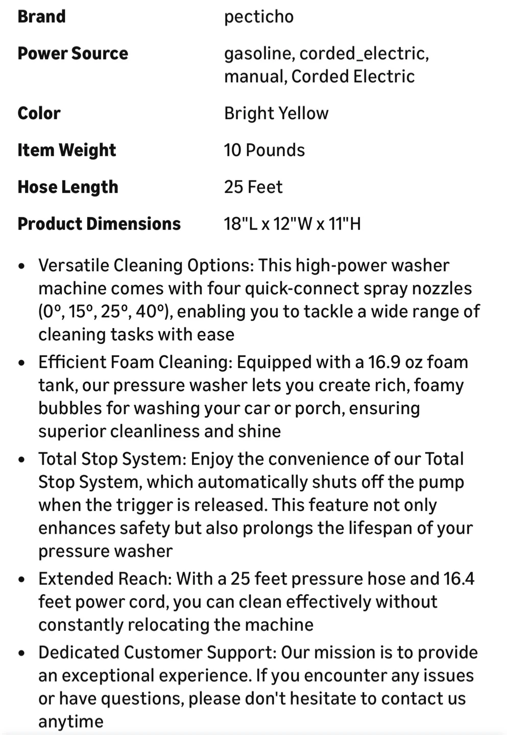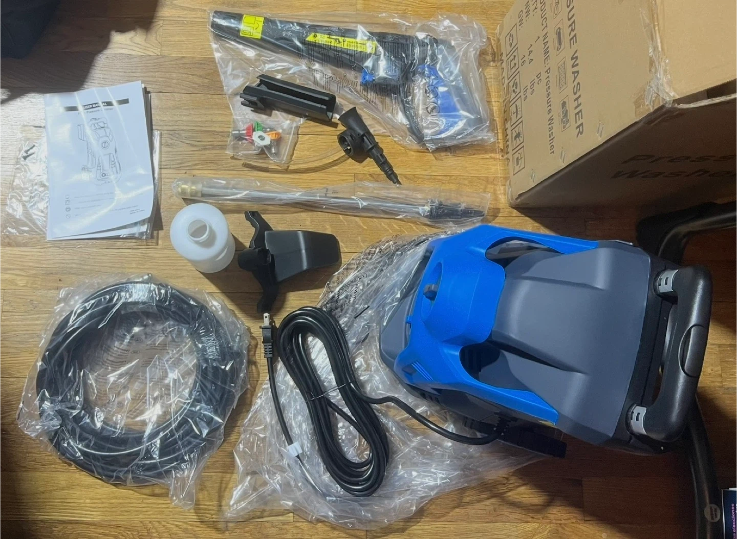 This is a Pecticho high pressure portable washer with 1800W of power. It comes with a spray gun, wand, four quick-connect spray nozzles, wheels for easy movement and extending handle. The unit includes a 25-foot hose and a 16.4-foot power cord. New with original box and instructions.