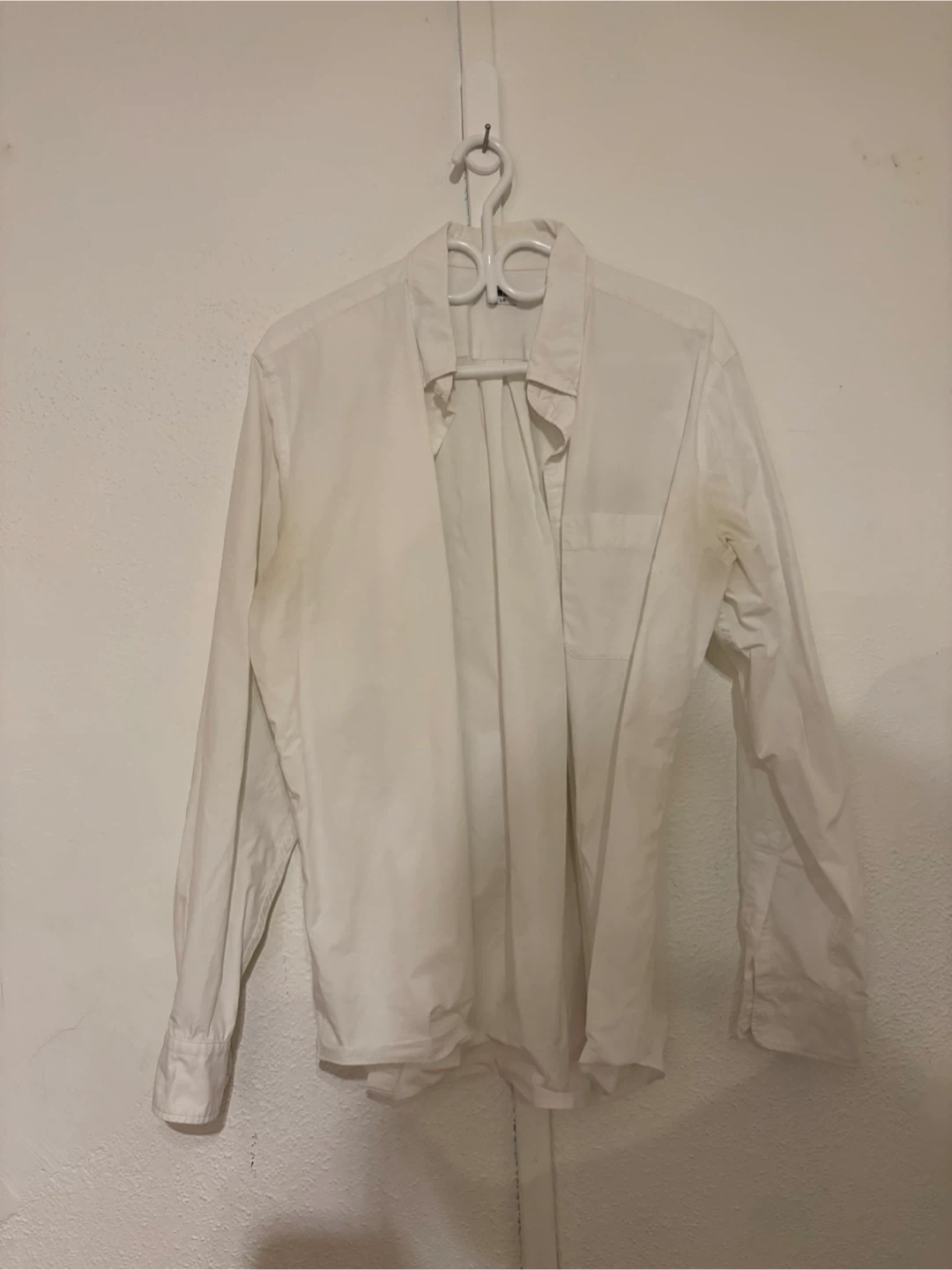 Selling a Uniqlo white button-down shirt in size L. It's in great condition and perfect for a casual or more dressed-up look. The material is comfortable and easy to care for. A versatile piece to add to your wardrobe!
