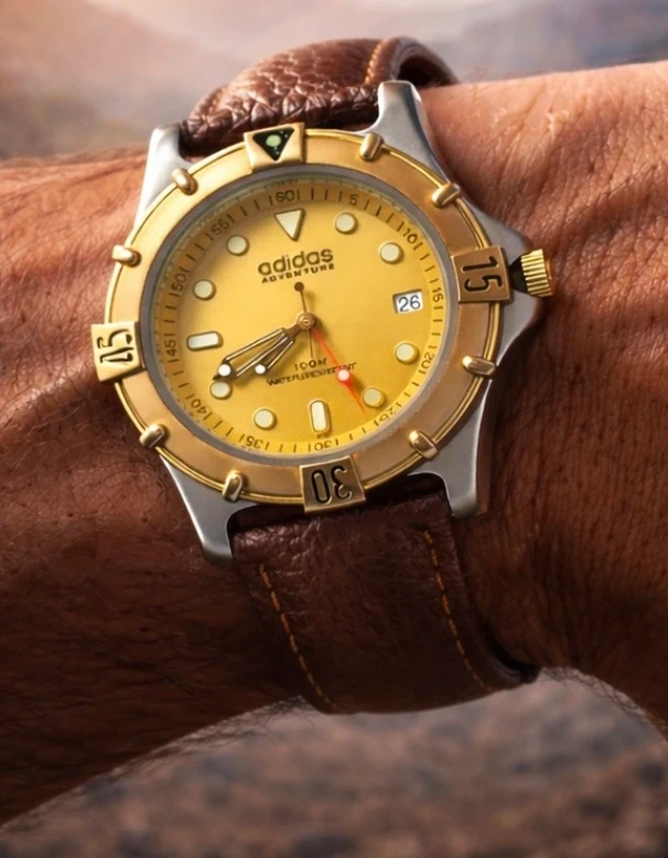 Adidas Adventure watch with a yellow dial. It's 100m water resistant. Comes with a brown leather strap.
