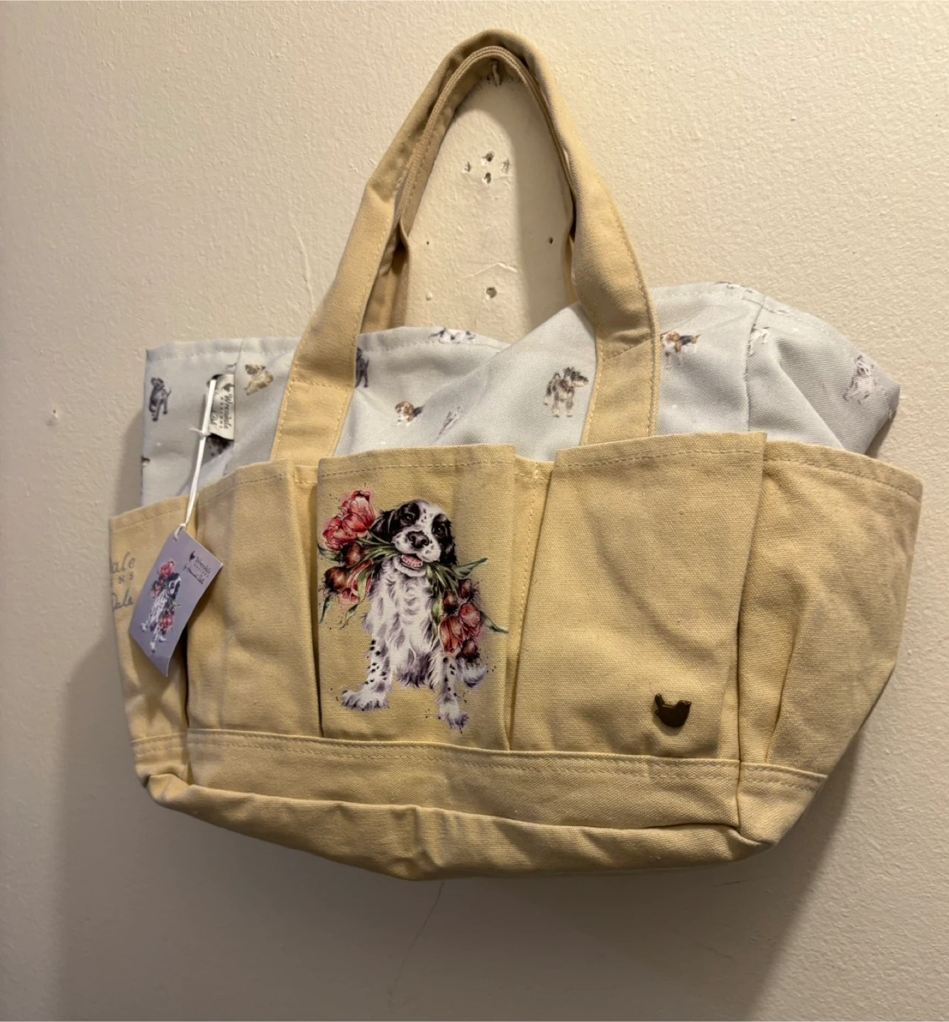 This Wrendale Designs canvas tote bag features a charming print of a dog with flowers, and a repeating dog pattern on the lining. It has an open top with exterior pockets for easy access. Durable canvas material.