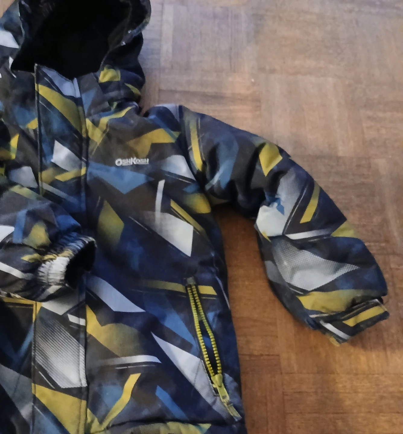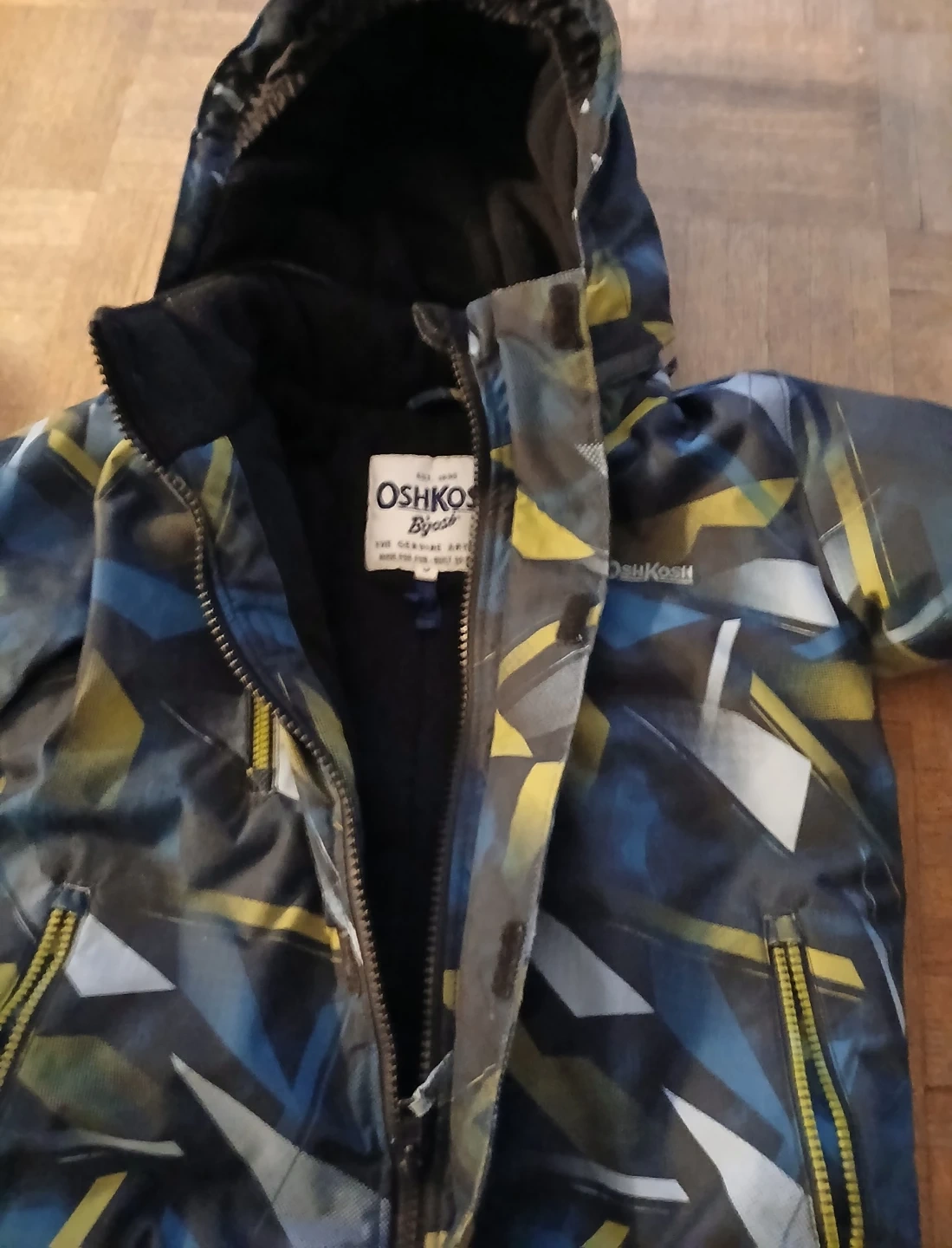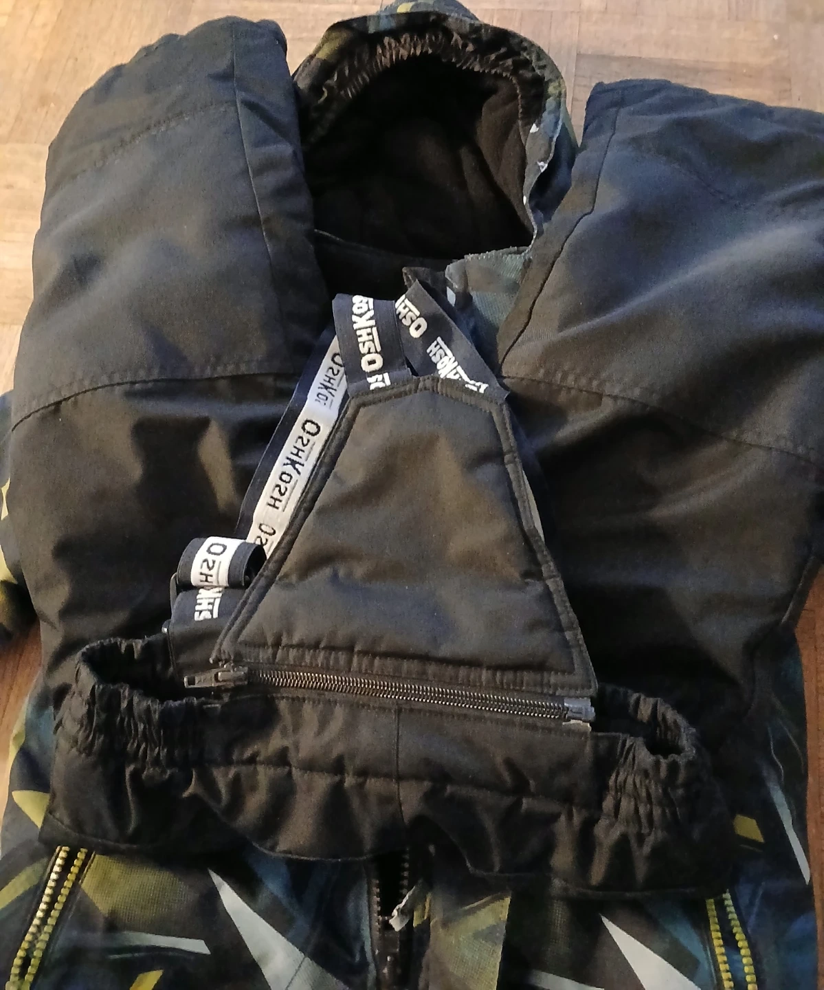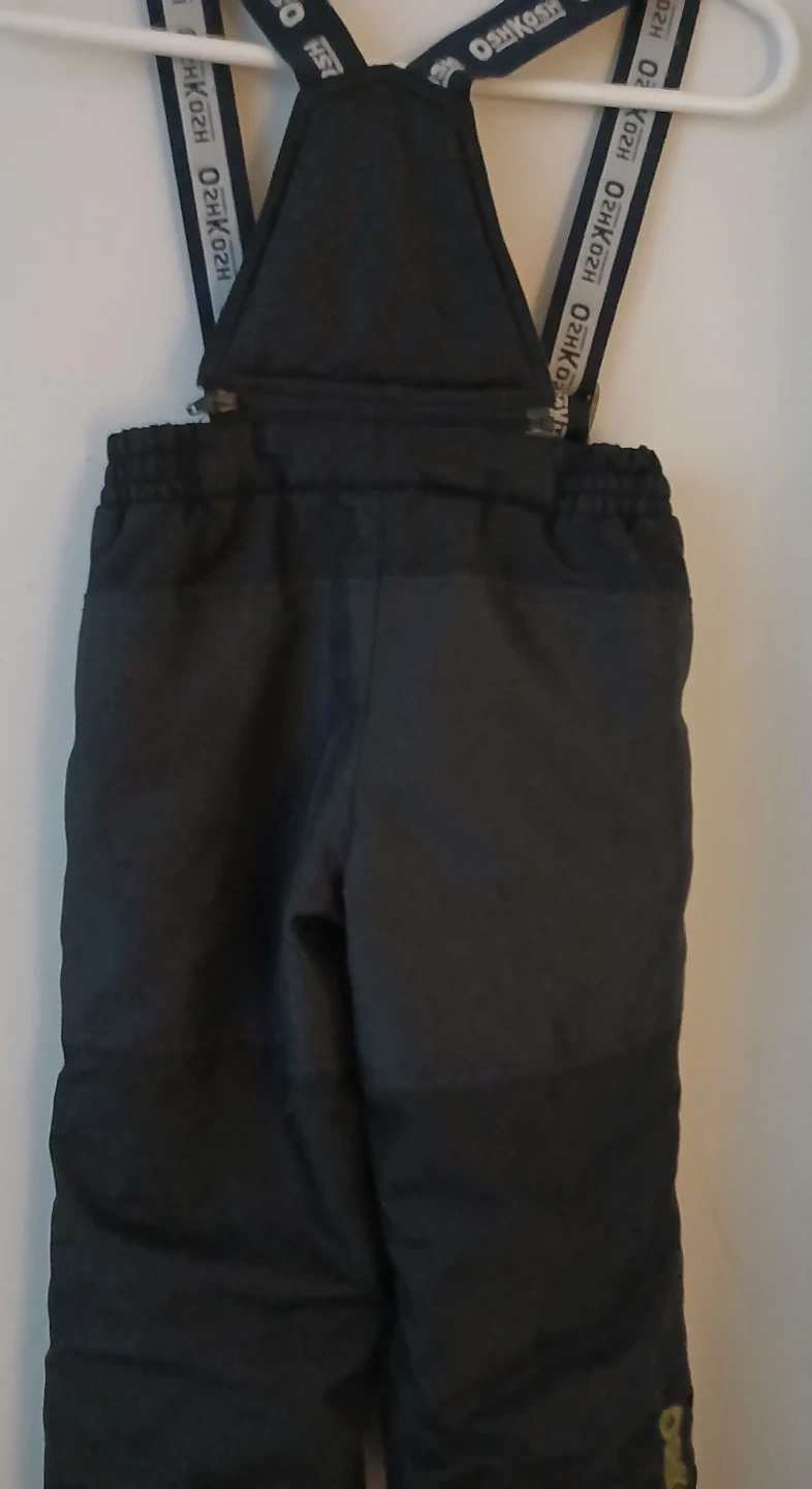 This OshKosh B'gosh set includes a colourful, insulated winter jacket and black snow pants with suspenders. It's designed for keeping kids warm and dry during colder months. The jacket has a patterned exterior with blue, yellow, and grey accents. The pants are black with adjustable suspenders and zippers on the legs.